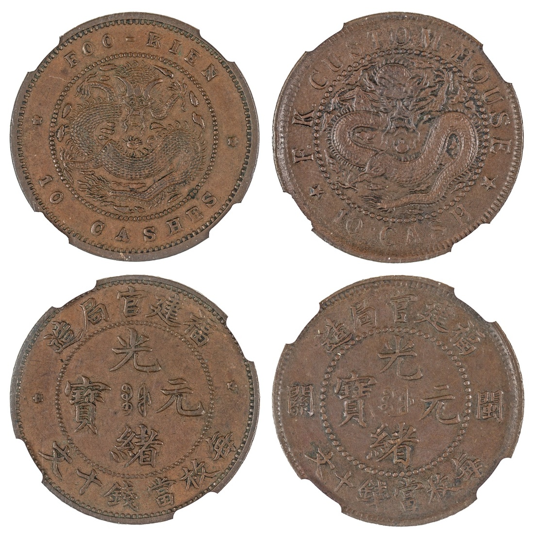 China. Imperial. Fukien Province. Pair of encapsulated 10 Cash, nd (1901-05). Facing dragon; F.K. CUSTOM-HOUSE *10 CASH*, large characters. Y.97; and FOO-KIEN 10 CASHES. Y.100.3. Both NGC AU 55 BN. (2)