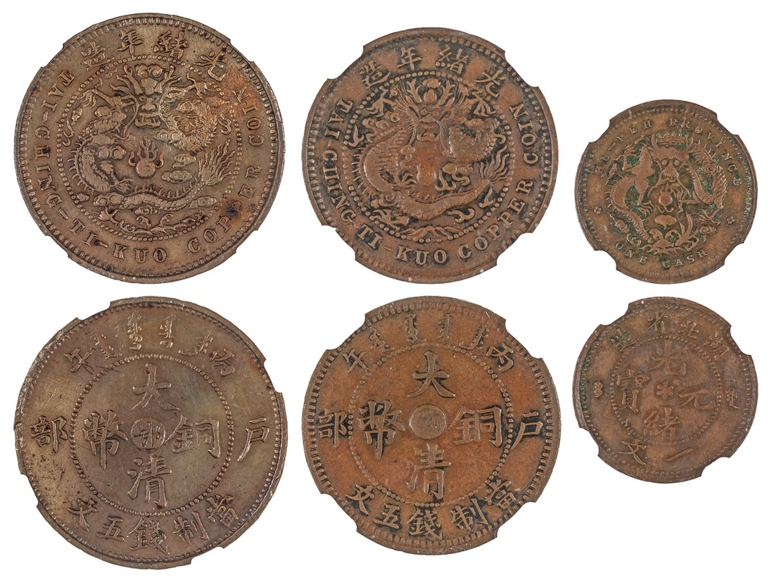 China. Imperial. Hupeh Province. Trio of NGC encapsulated 1906 facing dragon Copper issues. Cash. Y.121. AU Details, environmental damage; 5 Cash (2). Varieties - one peak cloud, XF 45 BN, and two peak cloud, AU Details, cleaned. Y.9J. (3)