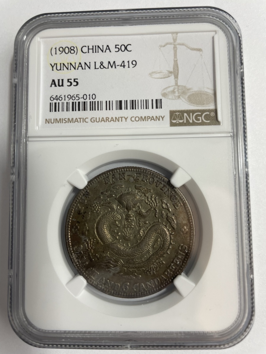 China. Imperial. Yunnan Province. 50 Cents, nd (1908). Dragon. Y.253, L&M 419. NGC AU 55. Attractive toning with soft iridescent hues.