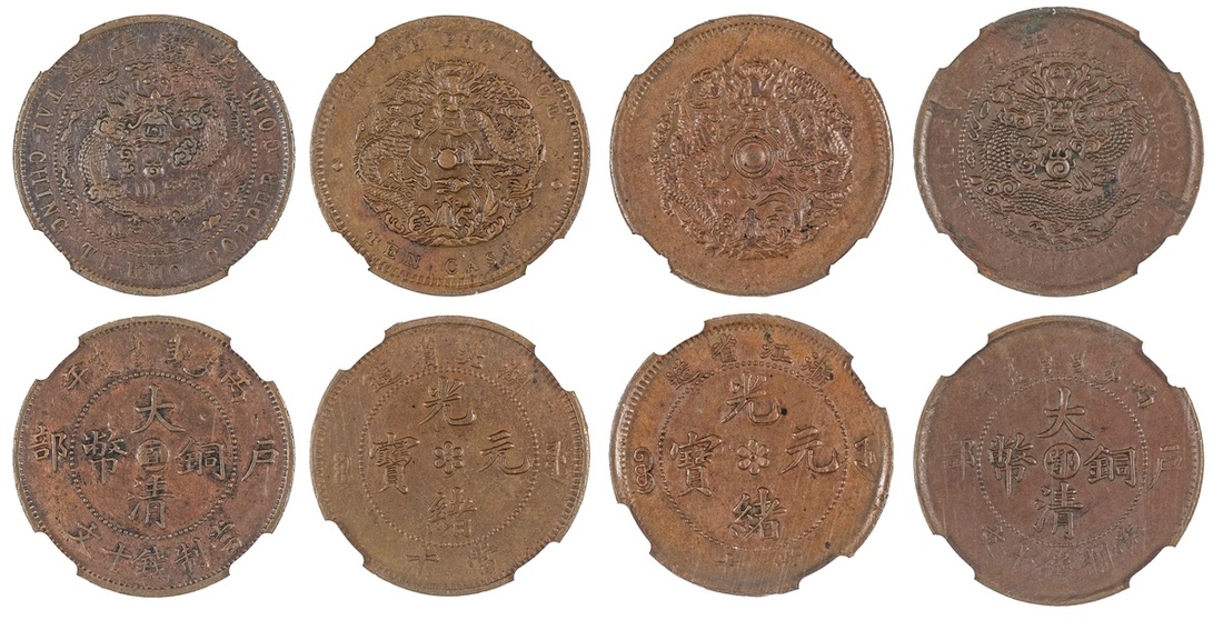 China. Imperial. Quartet of NGC encapsulated dragon 10 Cash. Chekiang Province. (1903-06). Two characters - large Manchu. AU 58 BN; Chihli 1906. Y.10c. AU Details, cleaned; Hupeh Province. (1902-05). Water dragon. AU 55 BN; 1906. Two peak cloud, thick stroke "Kwang". AU 53 BN. (4)