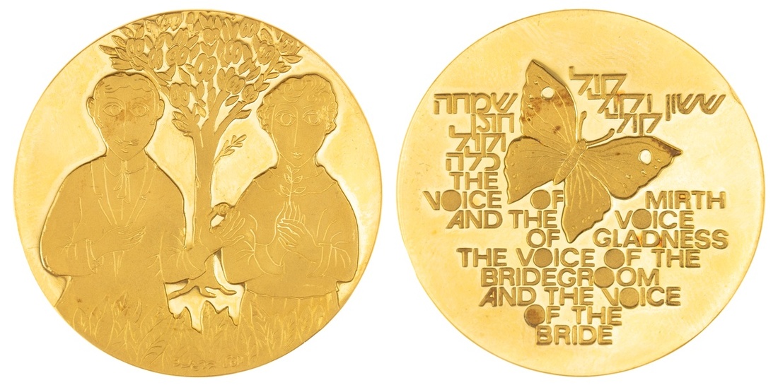 Israel. "Bride and Groom. Private edition Medal (1977), Israeli Art Issuing House, Ltd. (.917) Gold, 40mm. 40.03 gm. By Yosl Berger. Groom presenting ring to bride, tree behind, rev. Butterfly flying over Jeremiah 33.11 -- "The voice of mirth, the voice of gladness. The voice of the bridegroom and the voice of the bride". No. 228 of an issue of 500. In wooden case of issue with CoA. Brilliant Prooflike Uncirculated.