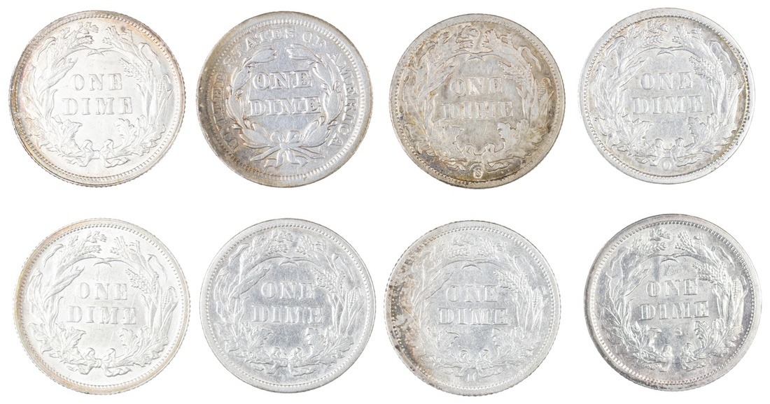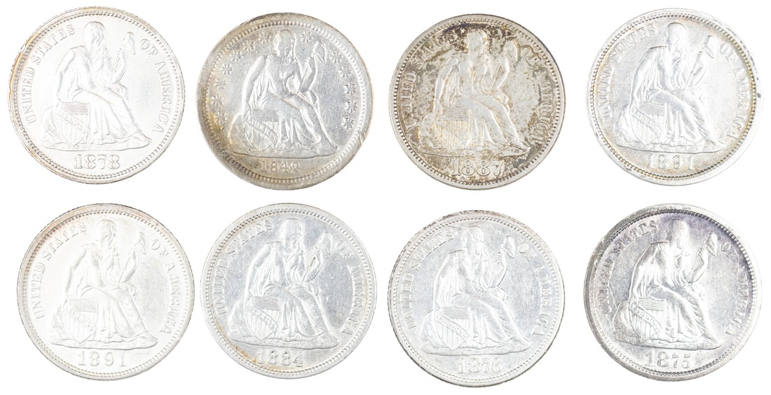 Octet of Liberty Seated Dimes: 1842, 1875-S, 1876-S, 1878, 1884, 1887-S, 1891, 1891-O. The first VF, toned obv. edge nick, the others EF-AU, a few once wiped. (8)