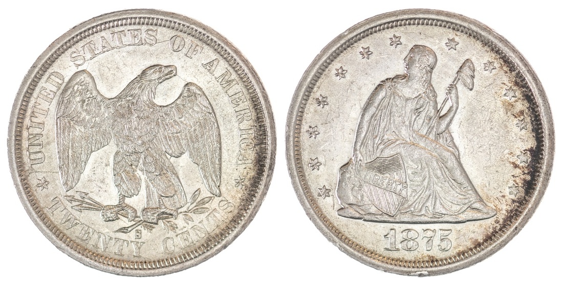 1875-S Twenty Cents. Uncirculated. Once wiped, now lightly toned, obverse stacking marks.