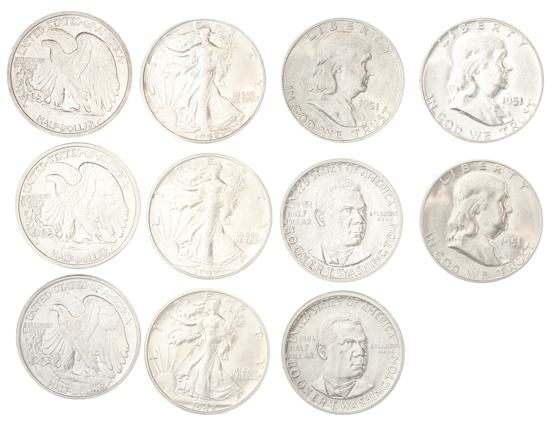 Lot of Walking Liberty Half Dollars, 1941-1945-S (34). AU-Uncirculated; also 1951 Franklins Halves (3) and 1946 and 1951-D Booker T. Washington Halves. Uncirculated. (39)
