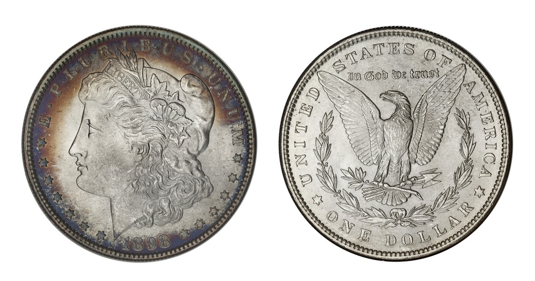 1898 Morgan Dollars. In 2012 PCI holder as MS 67. Obverse peripheral rainbow tone. Very Choice BU.