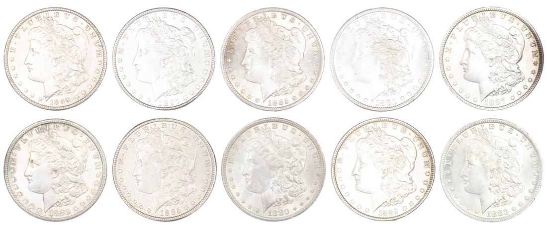 Lot of Morgan Dollars: 1880 (nick on cheek), 1881-S (2), 1883-O, 1885, 1885-O, 1887, 1889, 1890 and 1897. EF-Uncirculated. (10)