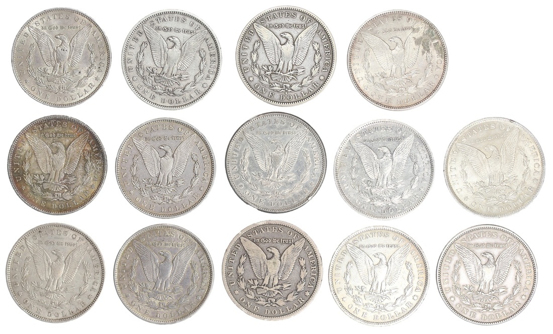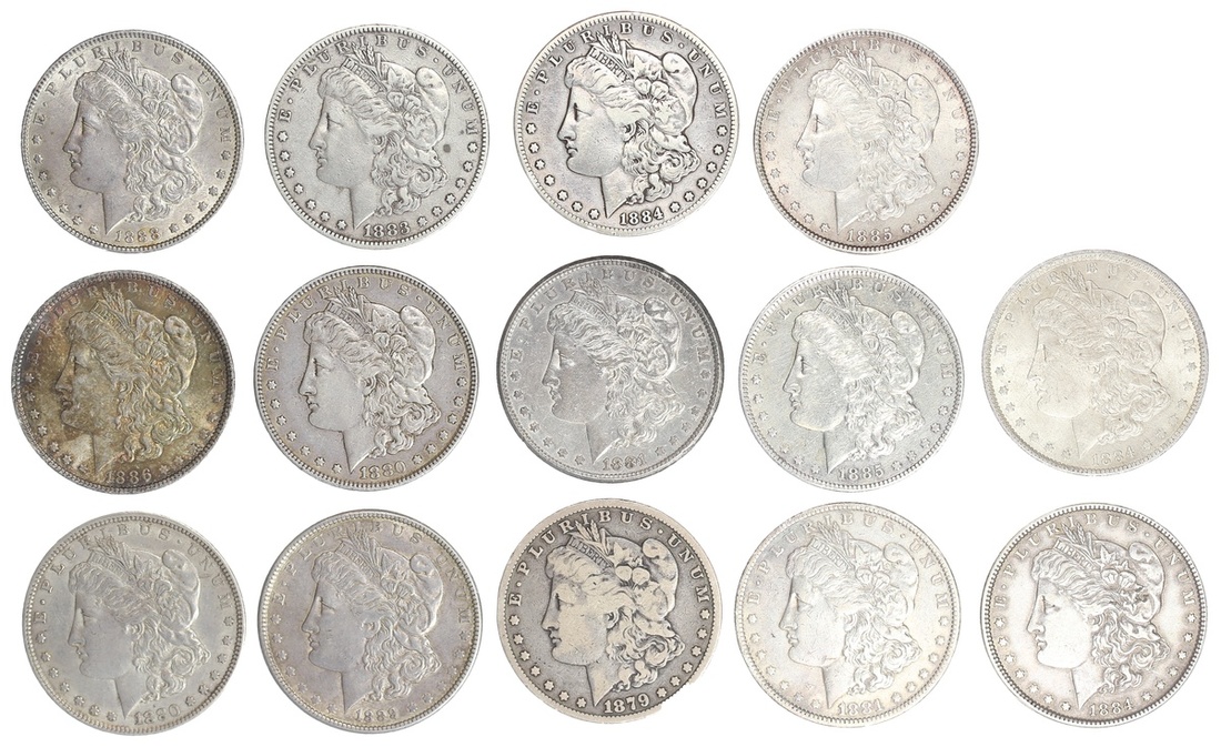 Group of circulated 1890's Morgan Dollars: 1879, 1880 (2), 1881-O, 1881-S, 1883, 1884, 1884-O, 1884-S, 1885, 1885-O, 1886, 1888, 1889. Some once cleaned, one with obverse scratches. (14)