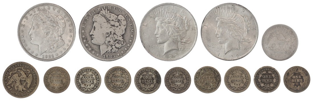 Quartet of circulated Silver Dollars: 1883, 1921, 1922, 1923; also an 1877-CC Liberty Seated Quarter. VG; 1853 Liberty Seated Quarter. Arrows and Rays. About EF details, cleaned; and Liberty Seated Dimes (9). Good. (15)