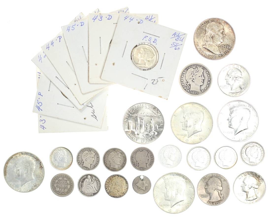 U.S. Miscellanea. Includes well-circulated Liberty Seated Dimes (10) and Half Dimes (4, one holed); Three Cent Silver (2, one holed); 1838 Capped Bust Half Dollar, reverse scratches1892-O Barber Dime VF cleaned; Barber Quarters (4), Dimes (8) Good-EF some cleaned; Mercury Dimes (13) AU-Unc; Silver Halves (4), Quarters (9), Dimes (6), 40% Half, circulated-Uncirculated; War Nickels (4) AU-Unc; 1983 Olympics Proof Dollar, 1992 Silver Eagle, one ounce Silver round (Buffalo), 1986-D Nation of Immigrants Half Dollar, 1971-S Eisenhower; Half Cents -- Draped Bust (5), Classic Head (3) and Draped Bust Cent - all with surface issues, Fair-Fine; a well-worn Capped Bust Dime, 1865 Two Cent piece and a few other minors.