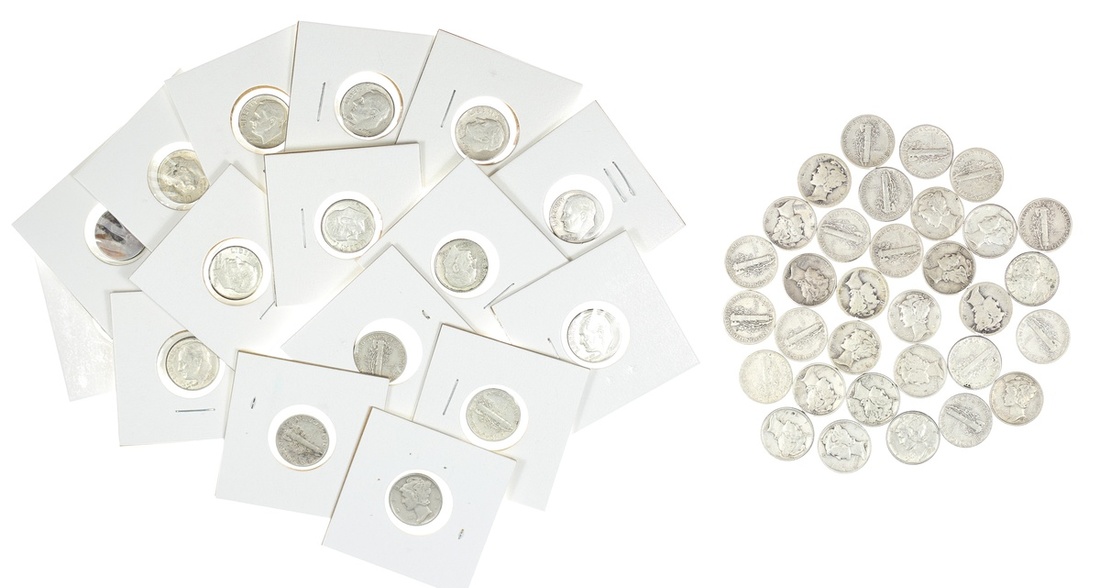 Circulated Silver Lot. Dimes - Mercury (178), Roosevelt (15); Quarters -- Barber, Standing Liberty (40); Washington (36); Half Dollars -- Walking Liberty (6), Franklin (5), Kennedy (3), 40% (3). Some Uncs.