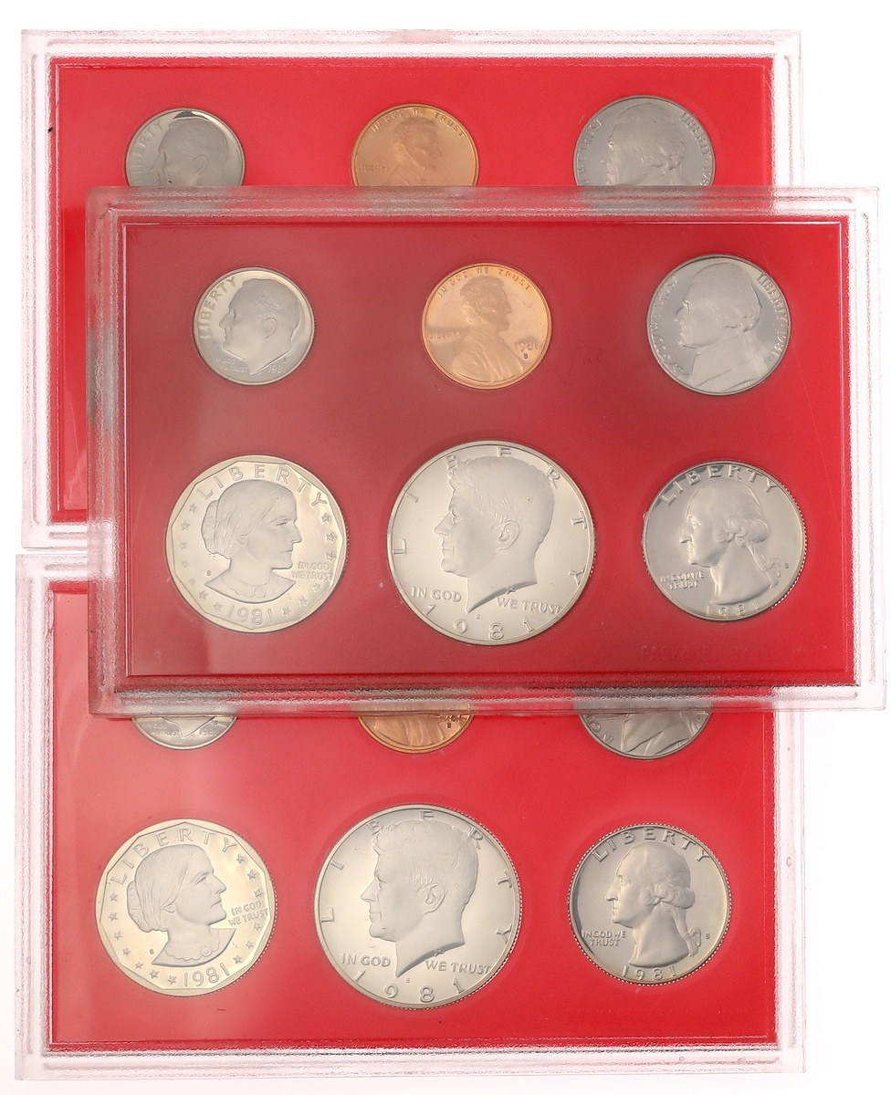 Three 1981-S Proof Sets with Type II Nickels, Quarters Half Dollars and Dollars.