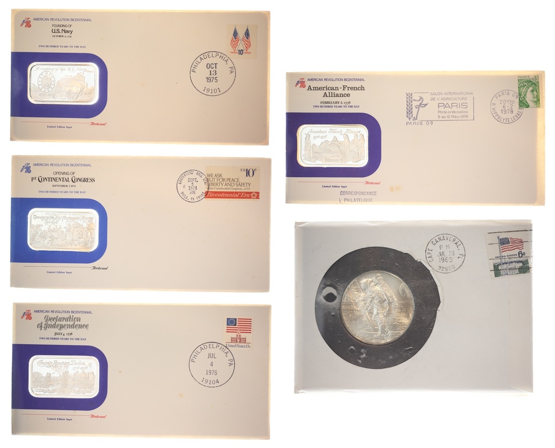 Modern Silver singles, sets and sundries. Includes: 1971-S Proof Eisenhower Dollar in original Mint holder; 1983 Proof Olympic Dollar in original cardboard frame; 1965 Special Mint Set; 1976 Bicentennial Silver Proof and Uncirculated Sets; American Revolution Bicentennial Silver (.999) 480 grain-ingots (5) in franked "Medalist Cover Society" cachet envelopes - US Navy, 1st Continental Congress, Declaration of Independence, US Flag, American-French Alliance, Serial No. 1762 of 4,000; also Moon Landing clad medal in cachet.
