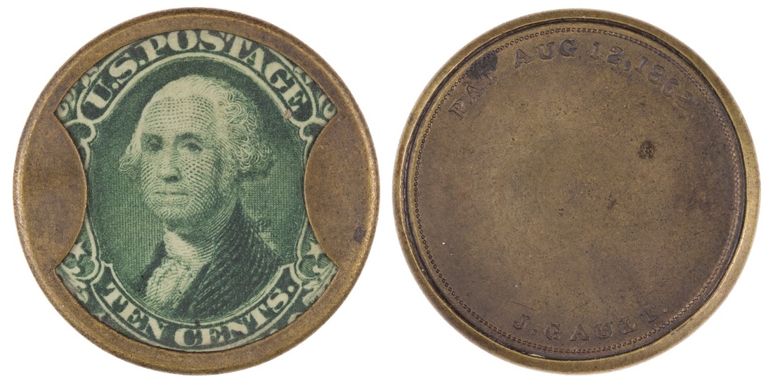 1862 10 Cents Encased Postage. J. Gault. Pat Aug 12, 1862. HB-133, EP-1116, S-97. Very Fine, hairlines to the mica.