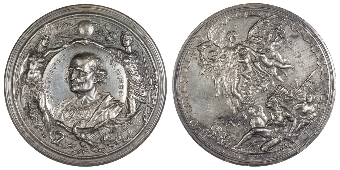 1892 World's Columbian Exposition. Cristoforo Colombo "Italian" Medal. Eglit 106. White Metal, 102mm. Plain edge. By Modello Carpuccio, and engraved by Lodovico Pogliaghi for Stefano Johnson, Milano. Bust 3/3 left; CRISTOFORO COLOMBO, supported by a native American and European princess, rev.. Civilization and cherubs alighting before a group of native Americans, Expo in the background, border of small shields with the Arms of the American republics. One of the largest medals issued for the Columbian Expo, and well regarded as the most beautiful. Some reverse digs below the cherub's feet, light obverse hairlines. Extremely Fine.