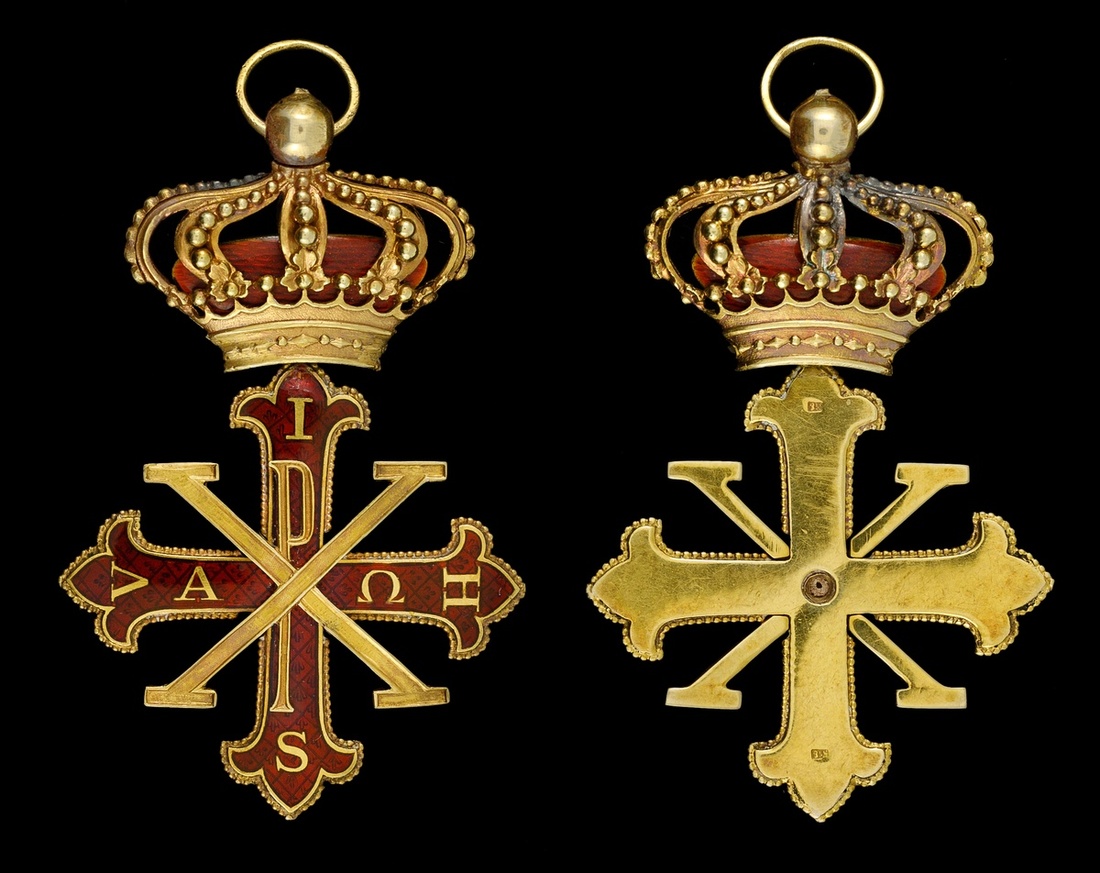 Italian States. Kingdom of the Two Sicilies. Constantinian Order of St. George . Badge. 45 x 70mm (including crown suspender). Gold (18K) and red enamel. Hallmarked "K18" twice on back of cross. Attractive and Choice Extremely Fine.
