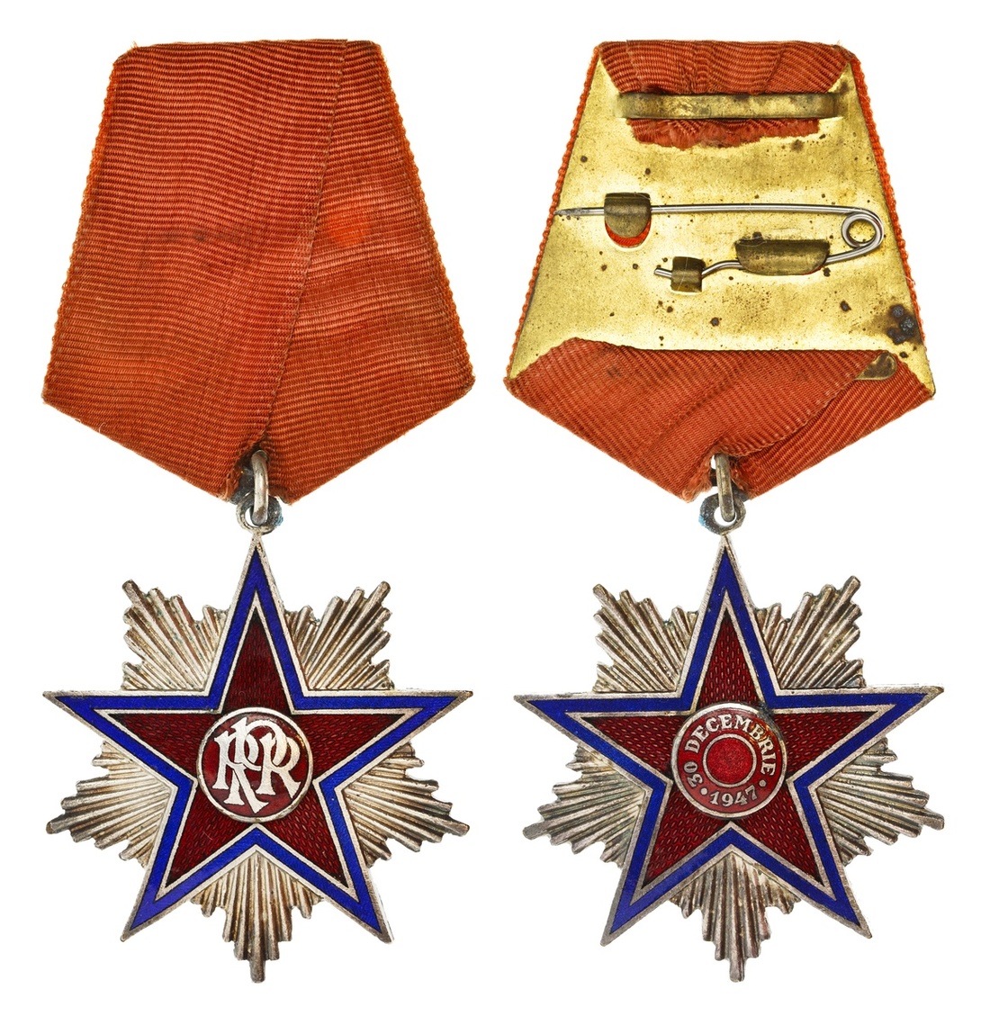 Romania. People's Republic. Order of the Star of the People's Republic - Ordinul Steaua Republicii Populare Române. 4th Class. Badge. No. 729. 1948. 48mm. Silvered Bronze, deep blue and red enamels. 30 DECEMBRIE 1947 at center of a blue-bordered red star; RPR monogram, silver rays in angles. Serial number stamped on inside edge of ray. On original metal-backed red moiré ribbon. In original case of issue. Scarce early issue. Minor deposit at center. Extremely Fine.