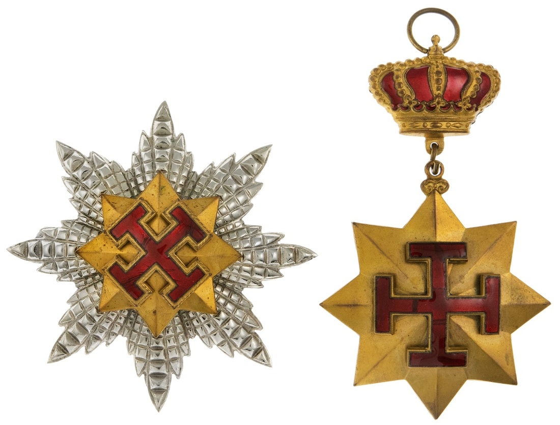 Private Orders. Order of St. George of Antioch. Commander's Set of Insignia. Neck badge. 59mm (not including large crown suspension). Gilt and red enamel; Breast Star. Silvered nickel? gilt and red enamel. 79mm. Horizontal pinback. Extremely Fine.
