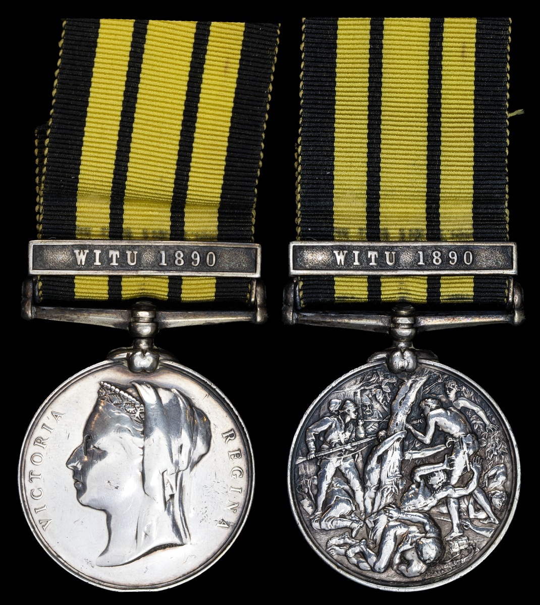 Great Britain. East and West Africa Medal, 1887-1900. One clasp: "Witu 1890" (A. BRADSHAW, A.B., H.M.S. KINGFISHER.). Impressed. On ribbon. Polished in the past. Fine/About Very Fine.