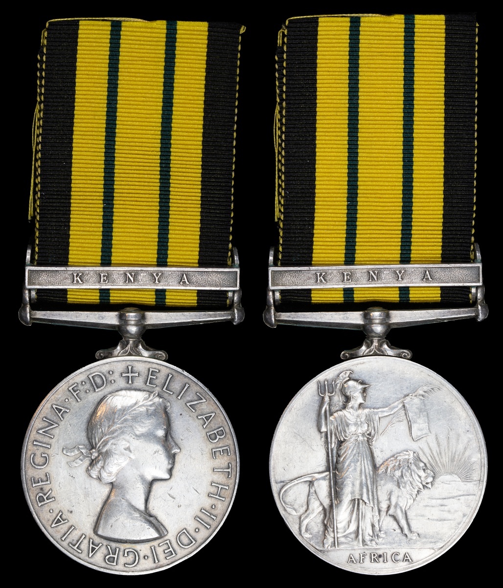 Great Britain. Africa General Service Medal, 1902-1956. Queen Elizabeth II. One clasp: "Kenya" (A.S. 374 A/I. (R). ABDUL RAOOF KHAN.). Impressed. On ribbon. Some friction hairlines and light contact marks. Extremely Fine.