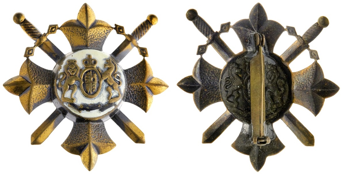 Great Britain. Badge. Bronze and enamels, pinback. Supported Arms on central medallion on cross, crossed sword. About Very Fine.