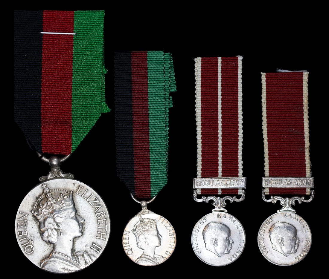 Malawi. Independence Medal, 1964. With Miniature. On ribbon. The full-size: friction hairlines, EF. The miniature. AU-Uncirculated; also Malawi Miniatures - Long Service and Good Conduct Medal, and Meritorious Service. Kamuzu Banda head right / Lion above sun. Uncirculated. (4)