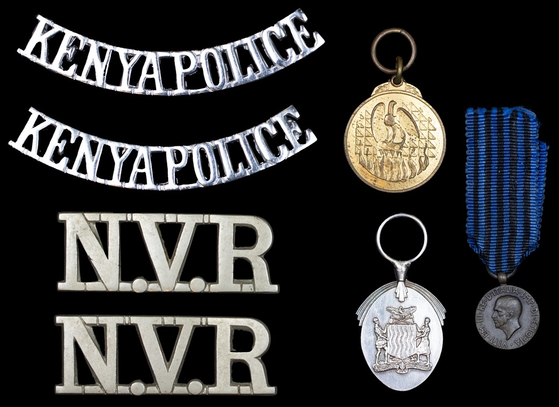 Lot of East and southern African Medal Miniatures and Insignia. Italian East Africa Medal. Miniature; Zambia. Long Service and Good Conduct Medal. Miniature, no ribbon; Zimbabwe Independence Medal, 1980. Bronze Miniature., no ribbon; and shoulder badge pairs - Nyasaland Volunteer Reserve and Kenya Police. EF-AU.