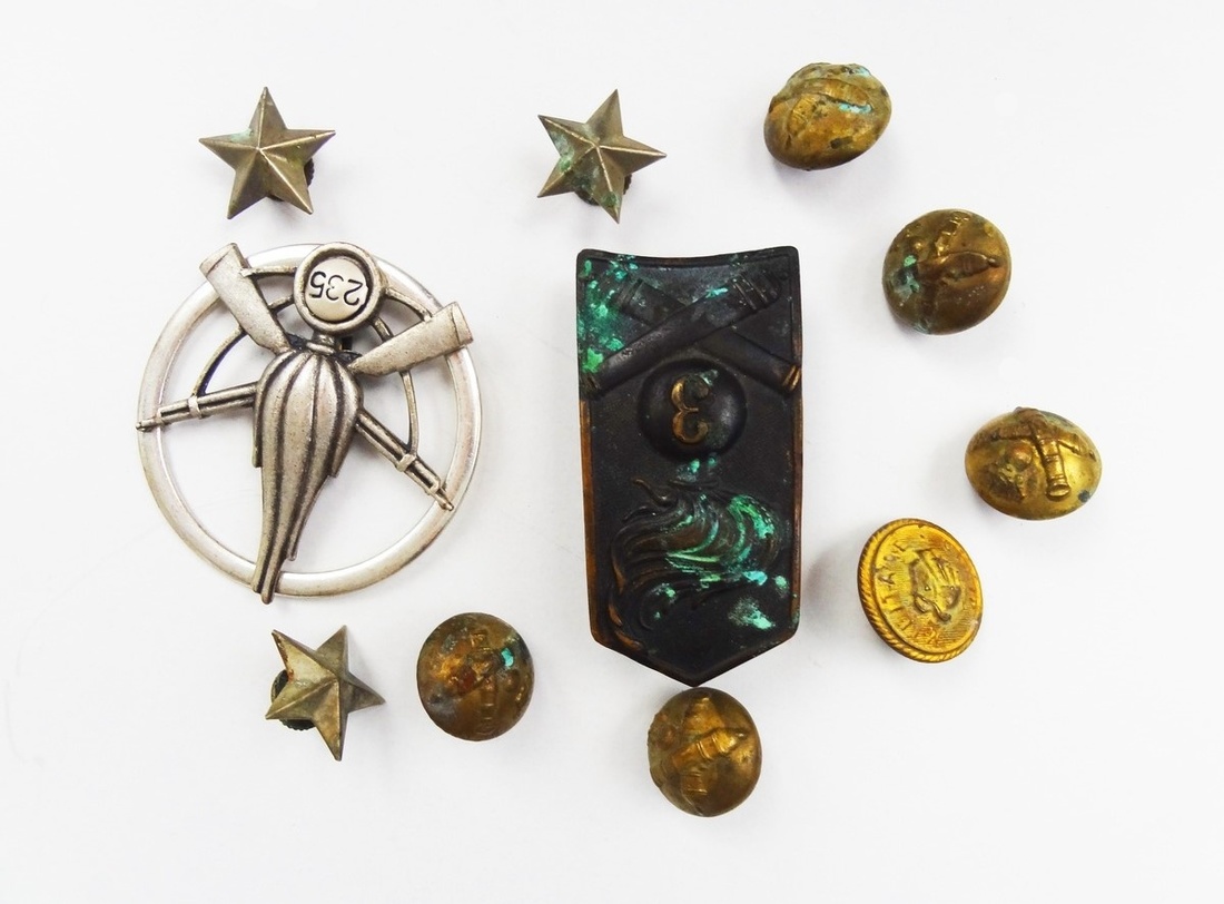Italian Military Buttons and uniform hardware group. 3rd Artillery badge, Artillery buttons (5), Sapper's Genio Militare button, star collar studs (3), and 235th Rifles Badge. Ca. WWII (?). Most with some deposits. (11)