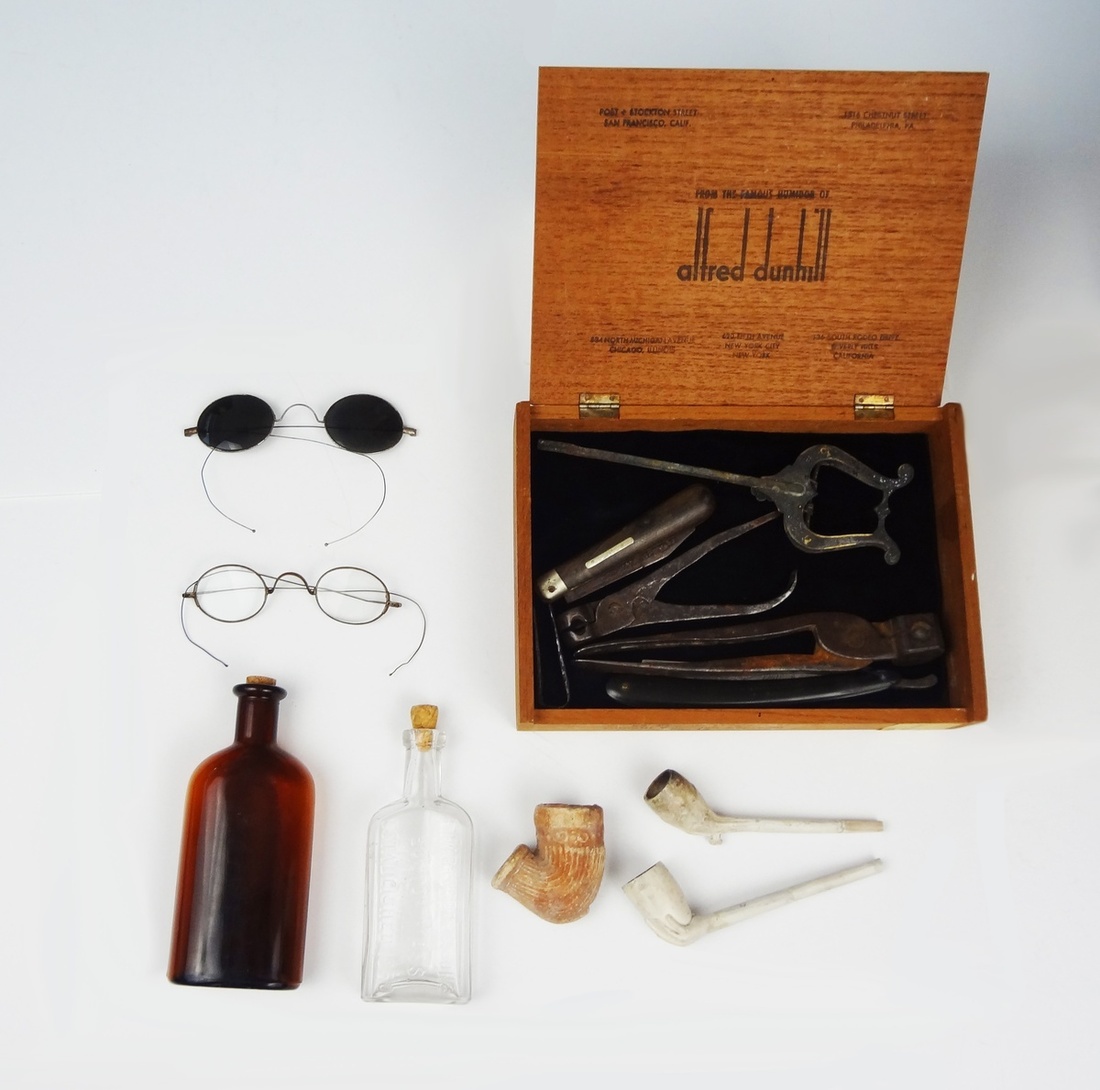 Lot of 19th-early 20th Century Artifacts. Civil War era miniballs, shot and assorted bullets; metal bullet cartridge and casing; Round ball bullet molds (2); matchsafe with Federal eagle; black powder flask (AM Flask & Cap Co.); metal tent peg. Key, US Army belt buckle; Opera Glasses by Le Maire, Paris; 19th Century wire rim glasses (2); clay pipes (2), straight razor (Imperial Razor Co., Germany), musical sheet holder (lyre), wood-handled pocket knife (blade rusty), clay pipe bowl, small brown apothecary bottle, small perfume bottles (2), Hartshorn & Sons medicine bottle; others, also, repro Lincoln Memorial belt buckle. Average wear. [50+]