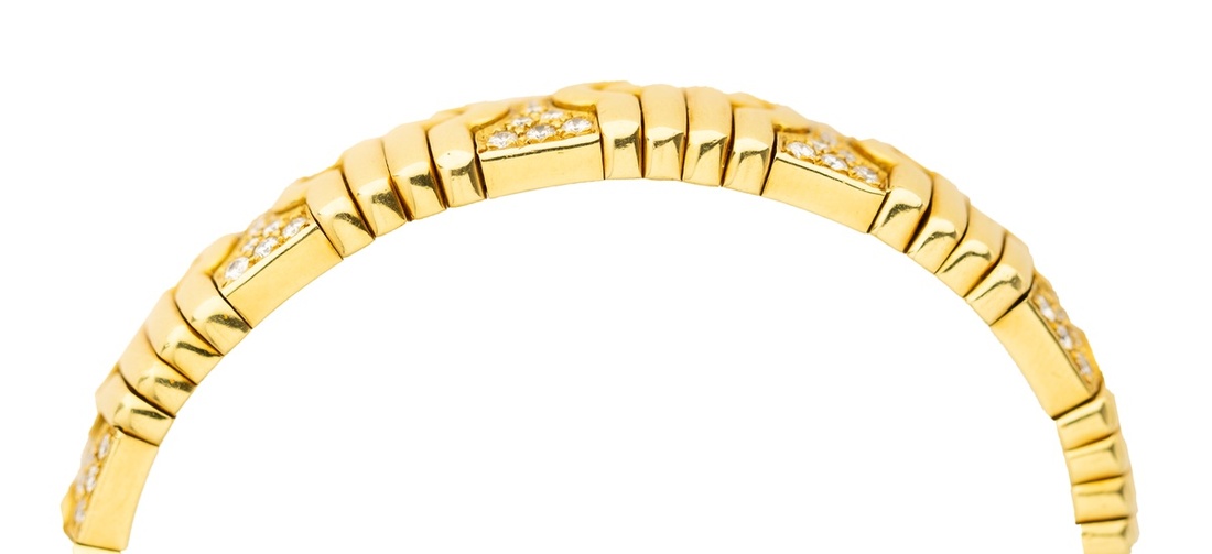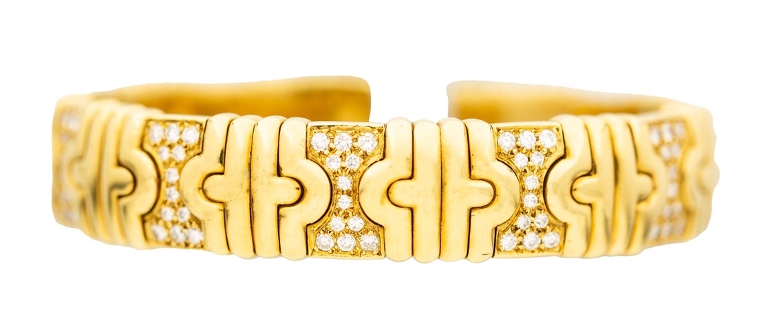 A stylish Ladies Gold Bracelet. 2" diameter. Aggregate weight: 86.3 gm. Overlapping stylized male-female pattern spaced by five diamond or zircon studded fields. Unmarked. Attractive.