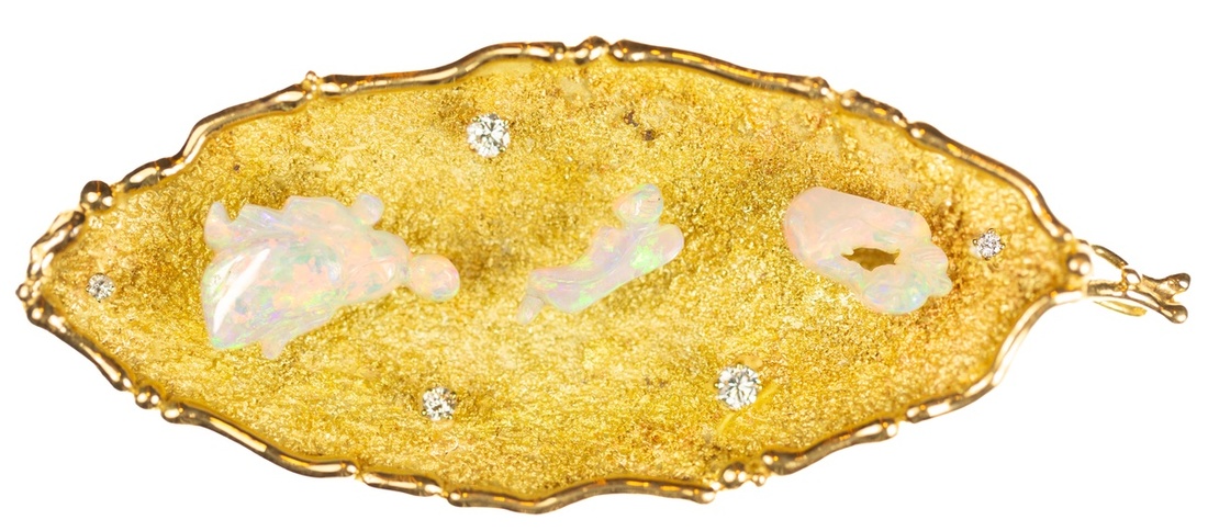 Massive Israeli 18K Single Earring with Mother of Pearl and Zirconium setting. 31.9 gm (aggregate weight); 80mm. Three modernistic mother-of-pearl figures on concave field with five zirconium settings. Hallmarked ISRAEL 18K. One pearl setting has come off (included).