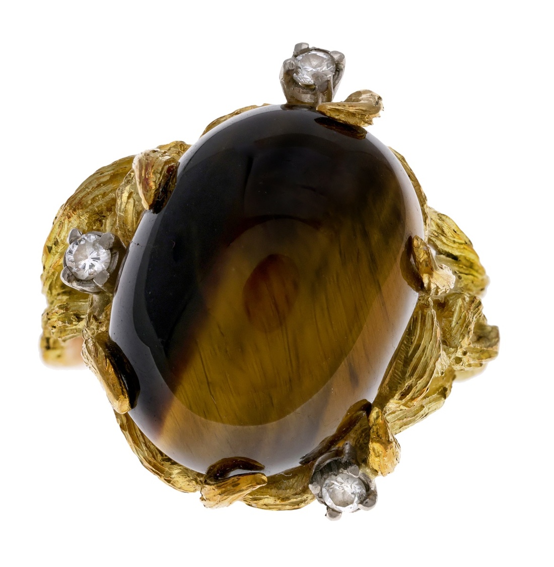 The necklace designed as a series of tiger's eye beads interspersed with fifteen gold spacers. Ring designed as a cabochon tiger's eye on claw set abstract band mounted with three brilliant cut diamonds. Band showing evidence of resizing. Band unmarked. Total weight 64g.
