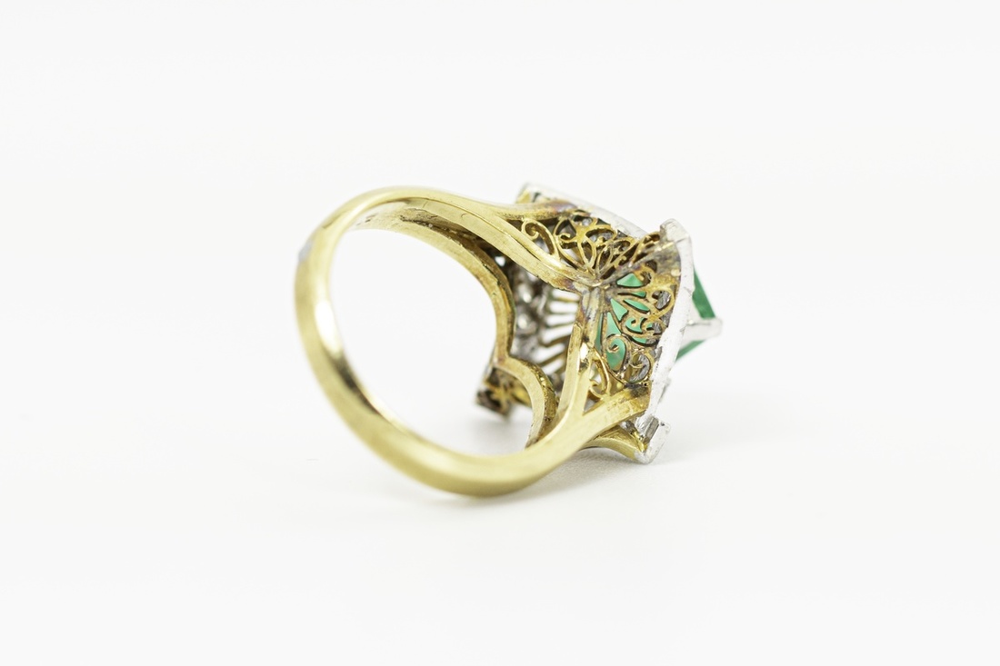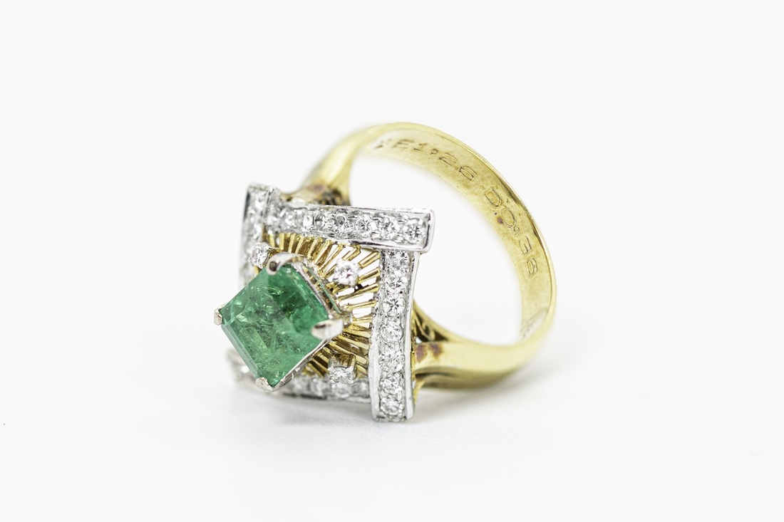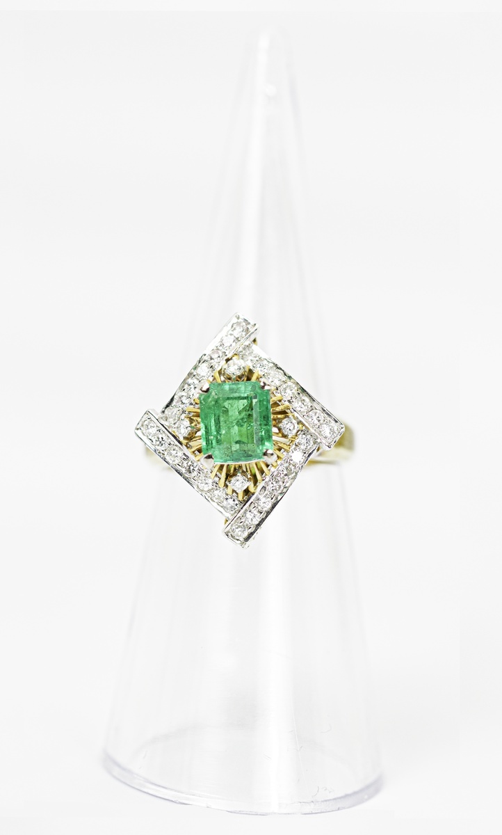 Emerald and Diamond Cocktail Ring. Claw set central stone (~ 1.26 ct) surrounded by 32 diamonds weighing collectively ~0.36ct. Set in 18 karat gold. Stamped 'E 1.26', 'D 0.36', and '18K750'. Total weight 6.50g. Ring Size 5 (US), J ½ (UK), 49 (Euro). Some stones display blue fluorescence under UV light. Emerald mid green in colour, transparent with typically seen inclusions, visible to the eye. An art deco inspired design, a statement piece sure to be noticed.