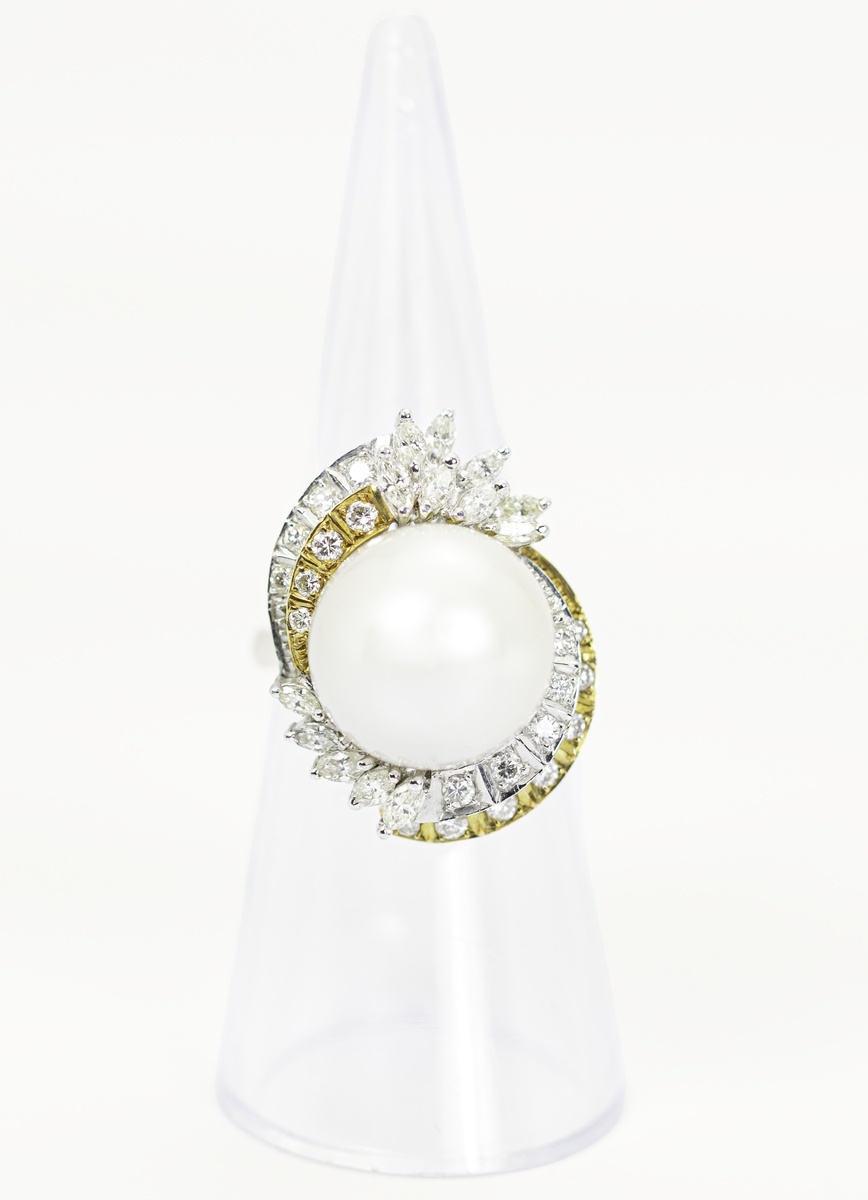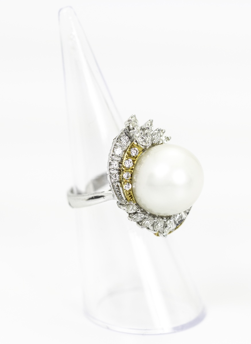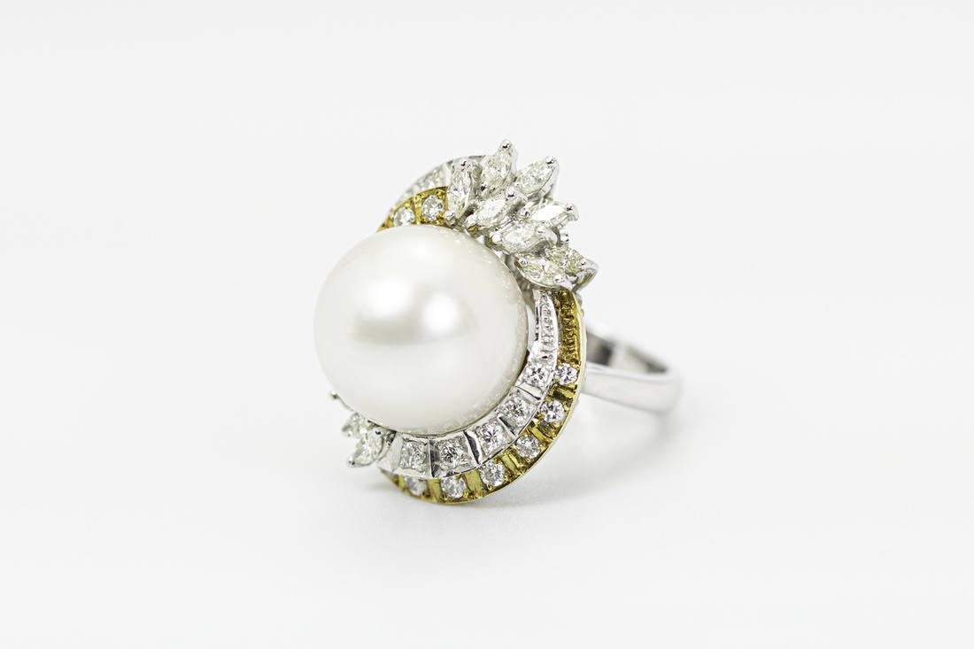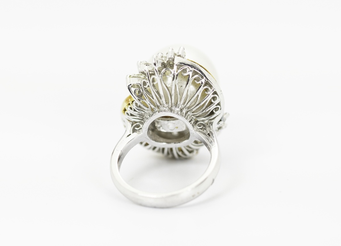 Pearl and Diamond Cocktail Ring. Large 14.2mm pearl surrounded by 32 graduated diamonds weighing collectively ~1.01 ct, some round-brilliant and others marquise cut. Set in 18 karat white gold with yellow gold accents. Stamped '18K750' and '1.01'. Total weight 14.66g. Ring Size 5.5 (US), K ½ (UK). Some stones display blue fluorescence under UV light, a showstopping statement piece.