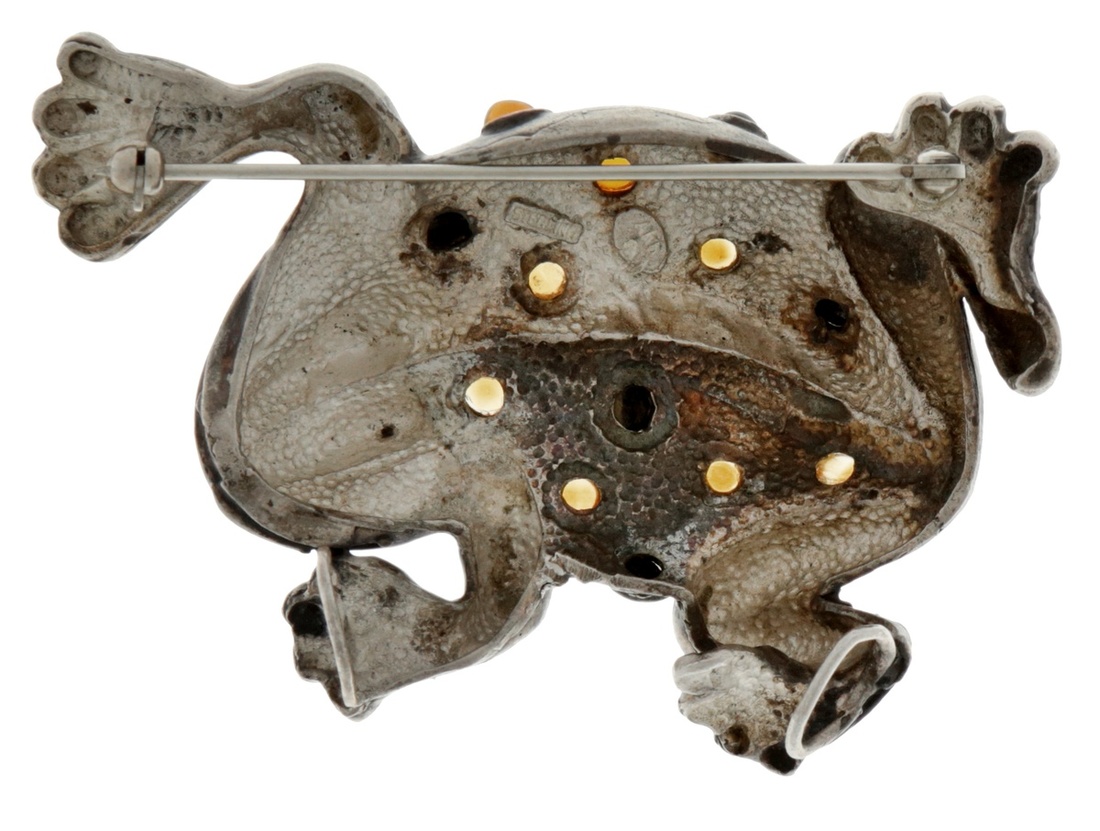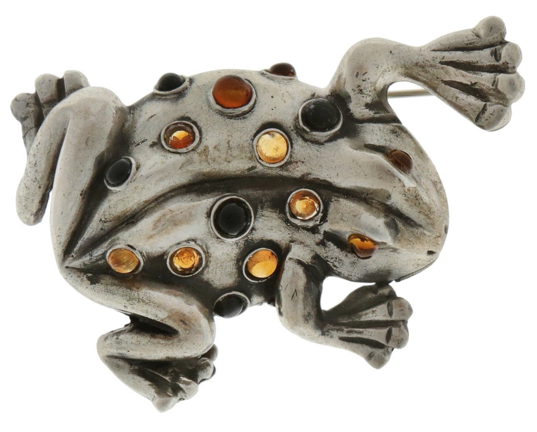 The silver frog brooch set throughout with multicolored paste stones. Possibly American. Stamped 'SERLING' and 'AKB'. Total weight 46.24g.