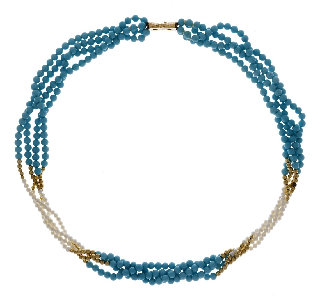 Designed as four strings of turquoise, seed pearl and yellow metal beads terminating in bow shaped gold clasp. Push piece clasp with safety. Clasp stamped '585'. Total weight 42g.