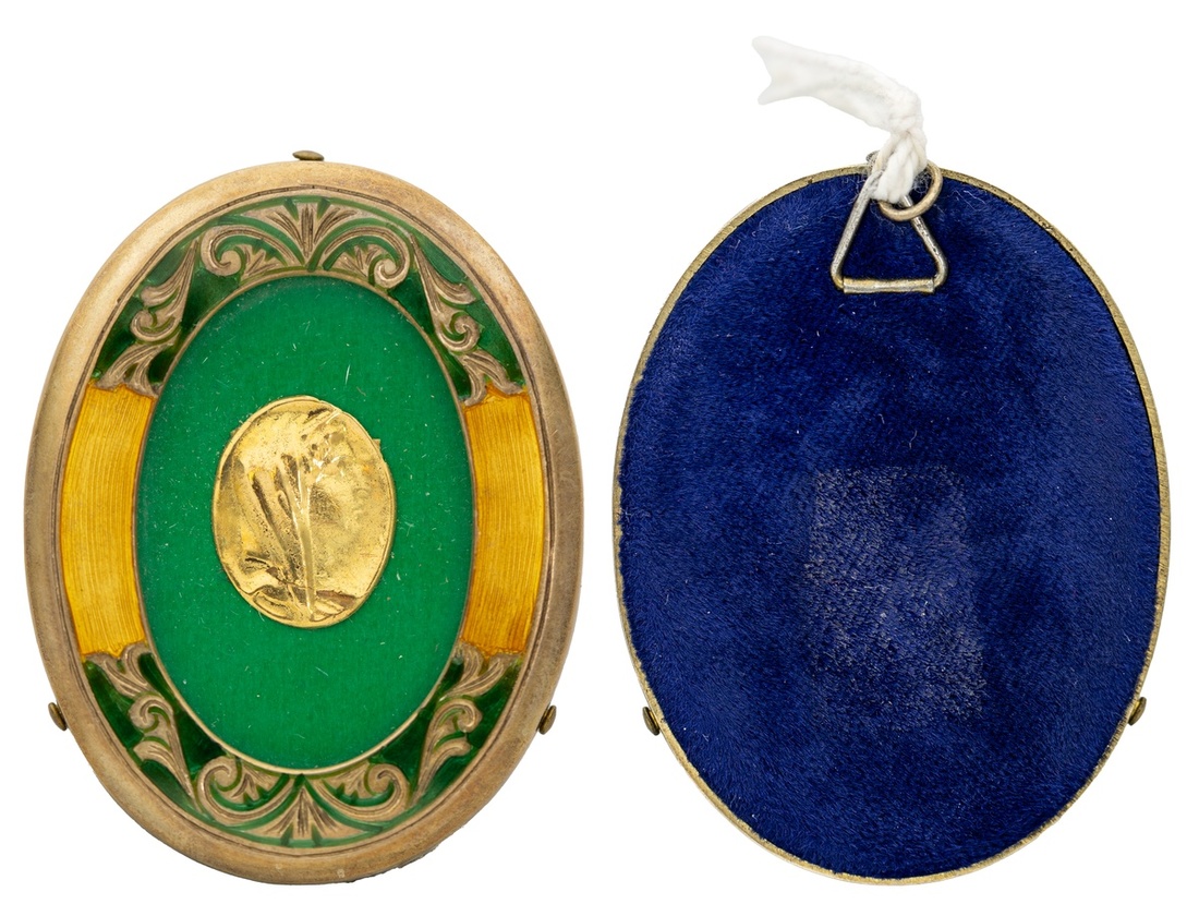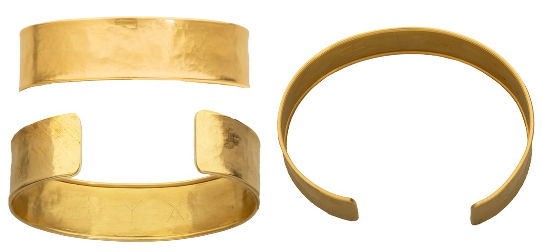 A curious Runic Bracelet. Lower-grade gold or gilt silver, 18.9 gm. Pale segmented tortoise pattern; on the inside, etched in, is a left-facing swastika, the rune algiz (elk) and gebo (gift) with a crossbar added (thus resembling more a common monogram found on ancient Greek coins); also an Italian Classical-style Gilt Silver Locket. Turreted and veiled female head on green background, floral border. Hallmarked "800".