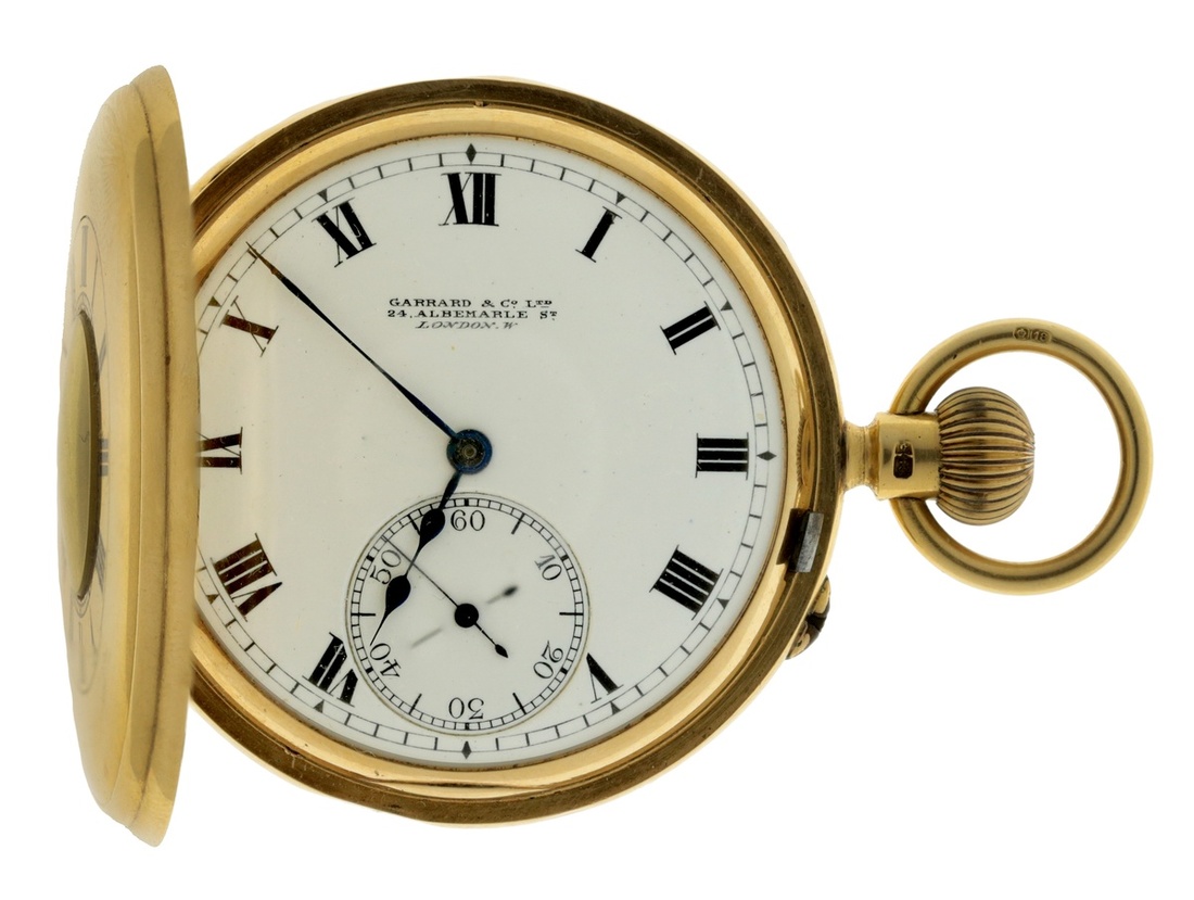 White enamel dial. Black Roman numerals with minute track. Blue steel hands. Dial stamped with 'Garrard & Co. Ltd, 24 Albemarle St. London W'. Seconds dial at six o'clock. Case number '6942'. Case stamped '18'. Hallmarks for London, 1911. Initials engraved to case reverse. Diameter 4.7cm. Total weight 100.18g.