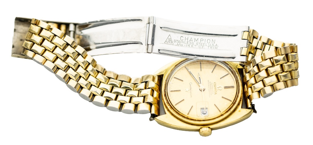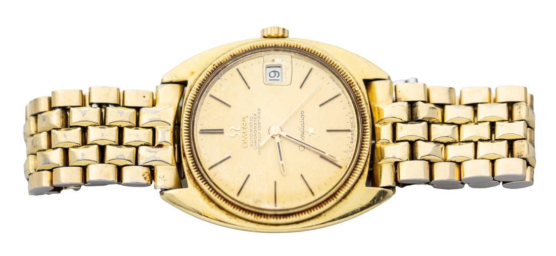 Omega Automatic Chronometer Constellation Watch. Ca. 1960s. Self-winding, Swiss-made. Stainless steel, gold color. Metal strap.