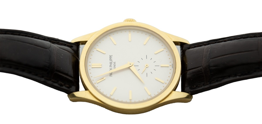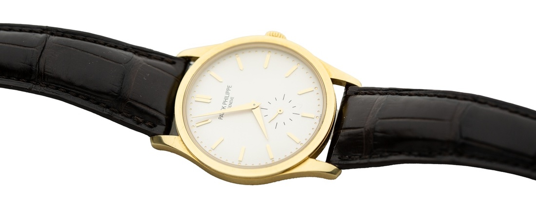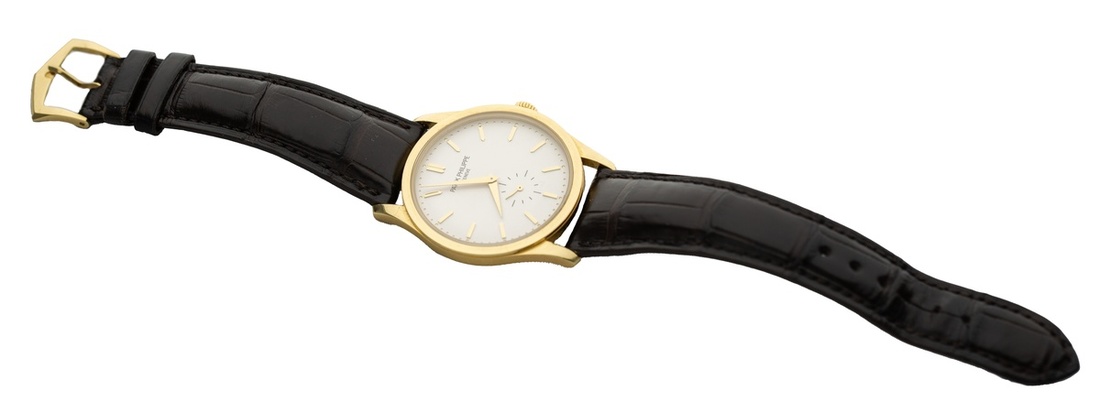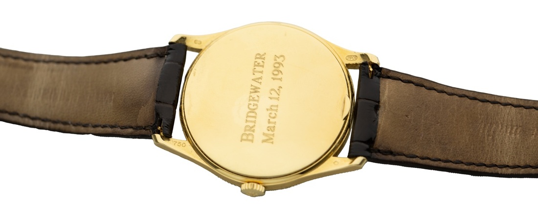 Patek Philippe Vintage Calatrava 18K Yellow Gold Manual Watch. Alligator band, no case. Engraved: "BRIDGEWATER March 12, 1993" on back.
