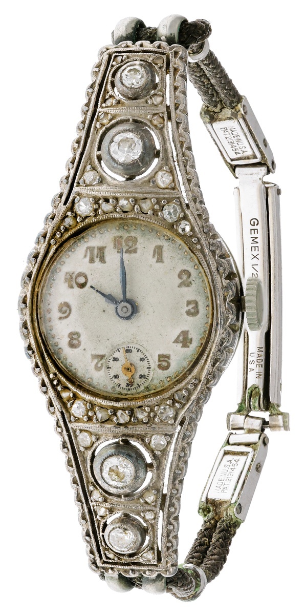 White enamel dial with Arabic numerals. Black steel hands. Seconds dial at six o'clock. The shoulders mounted with four large brilliant cut diamonds. The bezel and shoulders further mounted with numerous old cut diamonds. Later American strap. Dial dirty and in need of a clean. Movement not currently functioning. Total weight 12.6g.