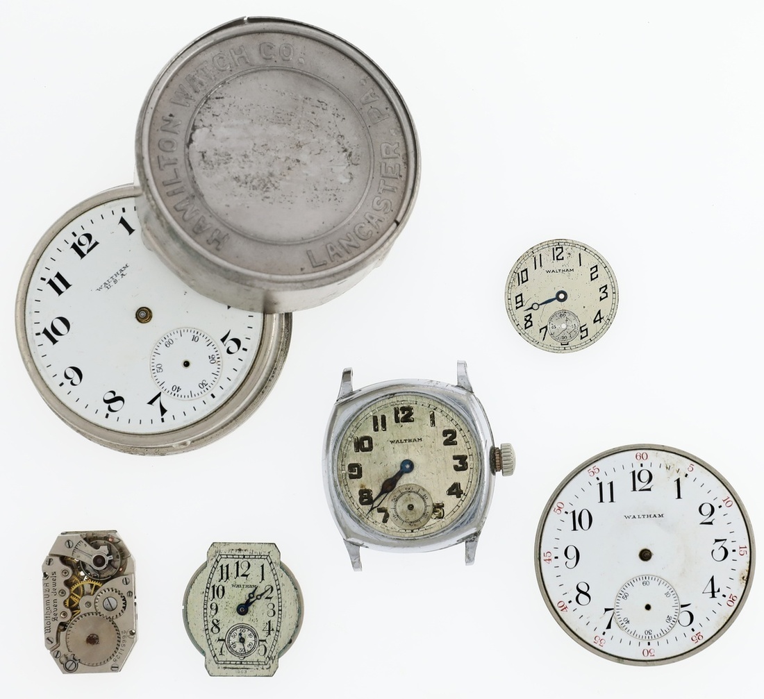Group of Waltham Watch faces. White enamel with black Arabic numbers and red seconds in intervals of five, 38mm. Missing hands; White enamel with black Arabic numbers, 40mm. Housed in Hamilton Watch Co metal case. Slightly cracked; 25mm; 17mm - polished metal missing hour hand; 20mm - polished metal with black Arabic numbers; and Waltham clock gears, 7 jewels. (6).
