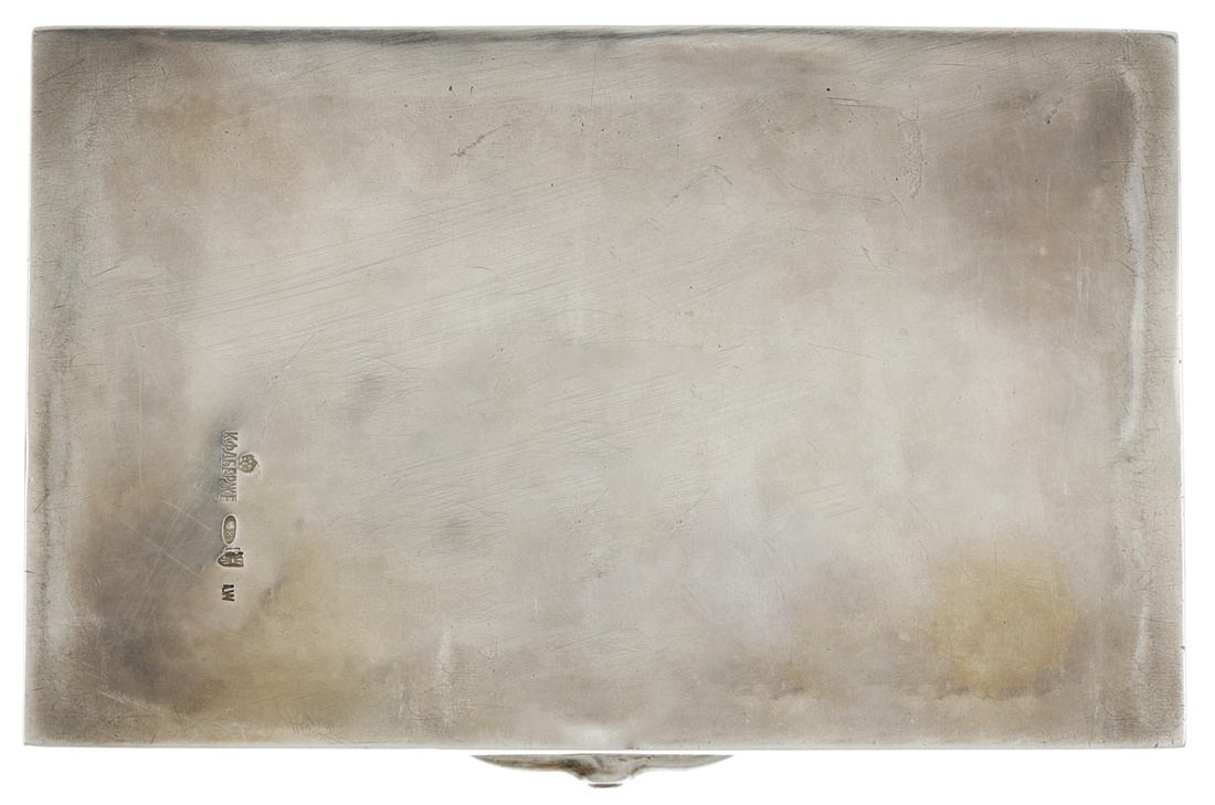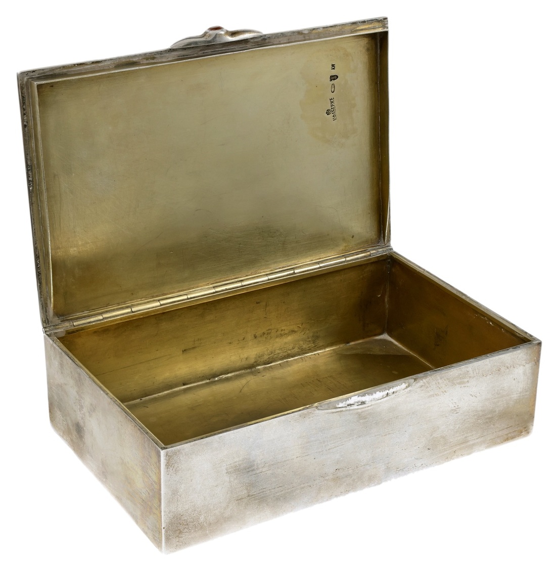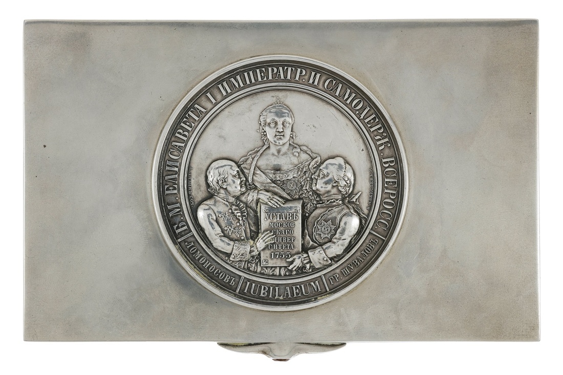 Imperial Russia A Silver Table Box by Faberge. Moscow, 1908-1916; Workmaster: Alexander Wäkevä. 6 1/8 x 3 ¾", 1 ½" high. 17.26 OZ. Obverse of the 1855 Centennial of Moscow University Silver Medal (Lomonosov and Shuvalov presenting the Charter of Moscow University to Empress Elizabeth) set in the lid; dark- orange cut stone or glass release. Faberge hallmark, Moscow silver mark "Cyrillic D(head right)84", plume/wheatsheaf mark and workmaster's initials "A.W." inside lid and again on bottom. "2376" etched below Faberge hallmark on bottom. Hairlines on bottom.