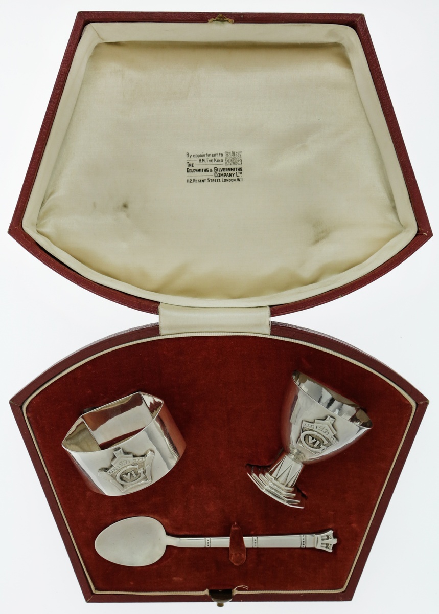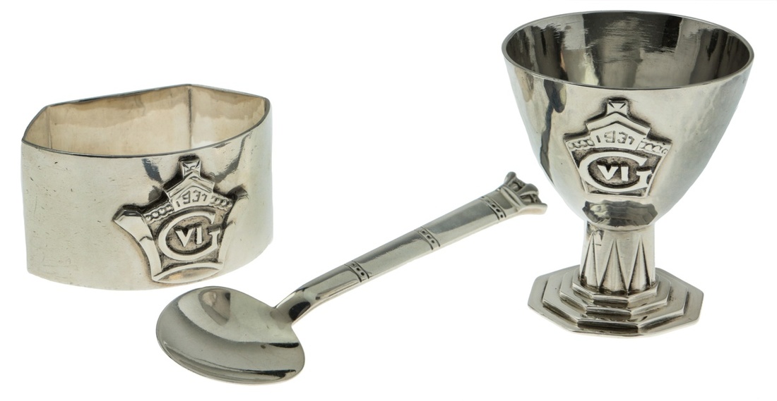 Comprising: Art deco style napkin ring, egg cup and spoon with applied crown motifs incorporating the date ‘1937’ and initials ‘GVI’. Housed in original fitted presentation case. This set was crafted to commemorate the coronation of George VI (1895-1952), which took place at Westminster Abbey in London on 12th May 1937. Total weight 107.21g.