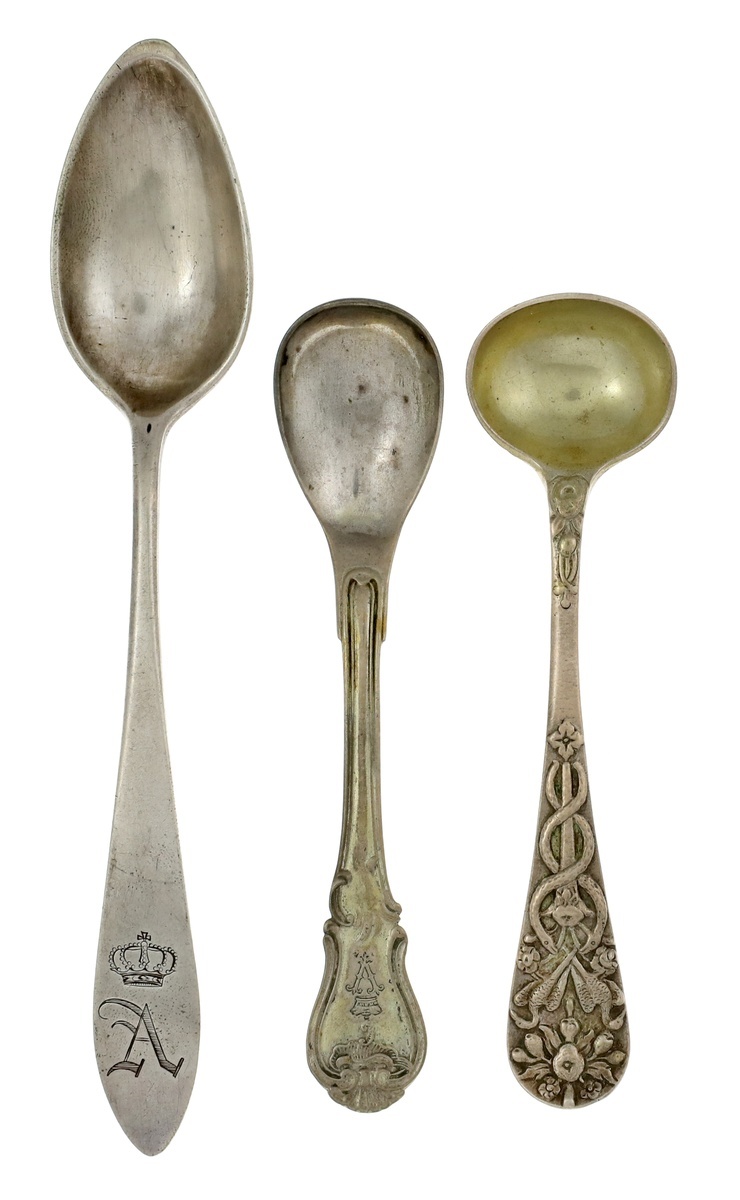 Trio of Imperial German Silverware. Teaspoon. Kassel, before 1850. 6". Crowned A monogram handle bottom front, crowned FWK III monogram on bottom back with city and assayer's mark and maker's mark "WK"; Condiment Spoon and Mustard Spoon. Mid-19th Century. 4 1/3". The first with Crowned V monogram handle bottom, stamped 750 and WILM. on back; the latter with ornate entwined serpents, double bird and floral pattern on handle, crowned V monogram on back. Hallmarks "875", "D" and maker "W" on back. 56 gms total.