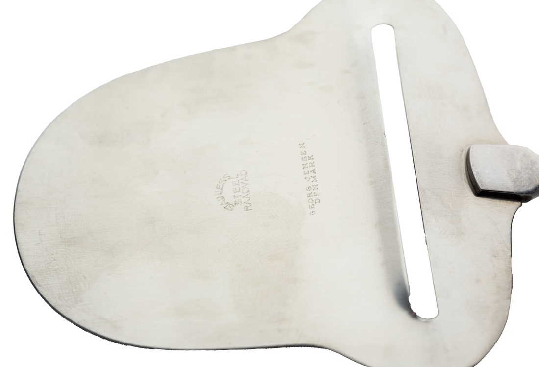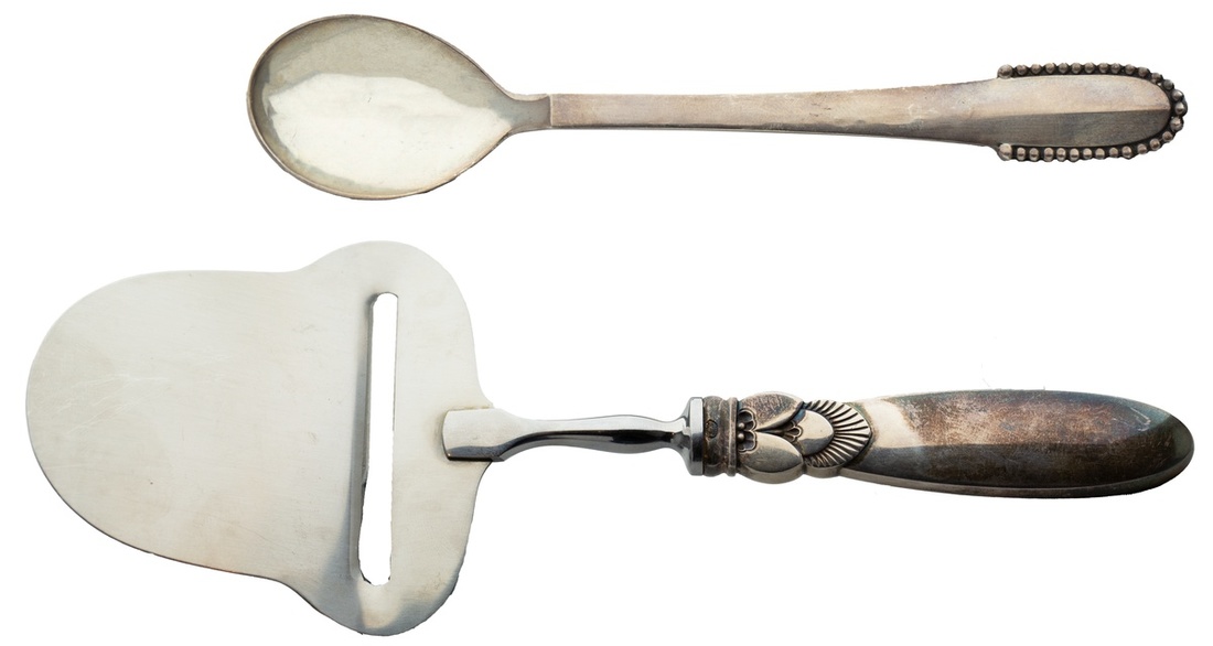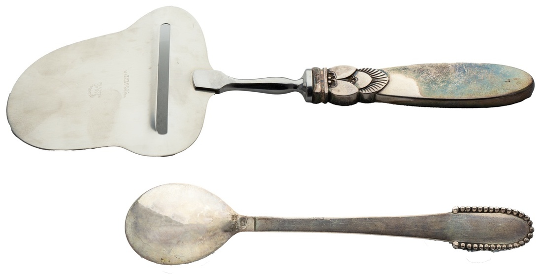 A George Jensen acorn-pattern Sterling Silver Cheese slicer. Ca. 1915-1920s; also, a George Jensen beaded Sterling Silver Teaspoon. Ca. 1916-1930s.