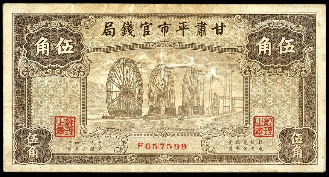China. Republic. Kansu Provincial Bank. 50 Cents. 1935. P-S2246. Brown; blue back. Water wheels at center. Very Fine.