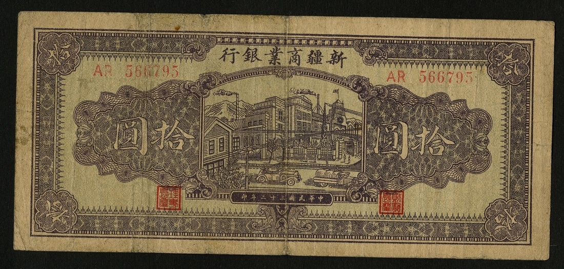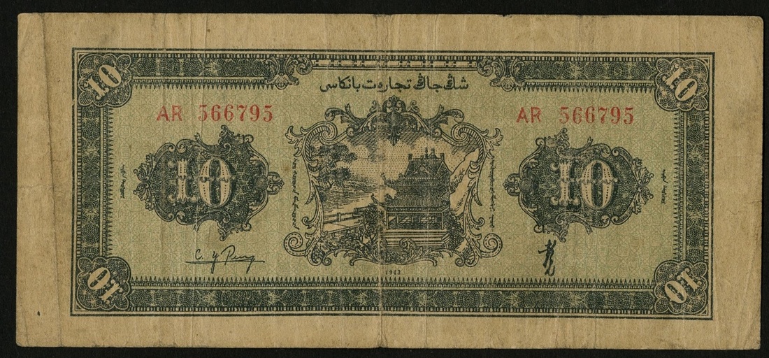 China. Sinkiang (Xinjiang). Sinkiang Commercial and Industrial Bank. 10 Yuan. 1943. P-S1763. Buildings with car and truck driving on street at center; Rural house at back center. About Fine.