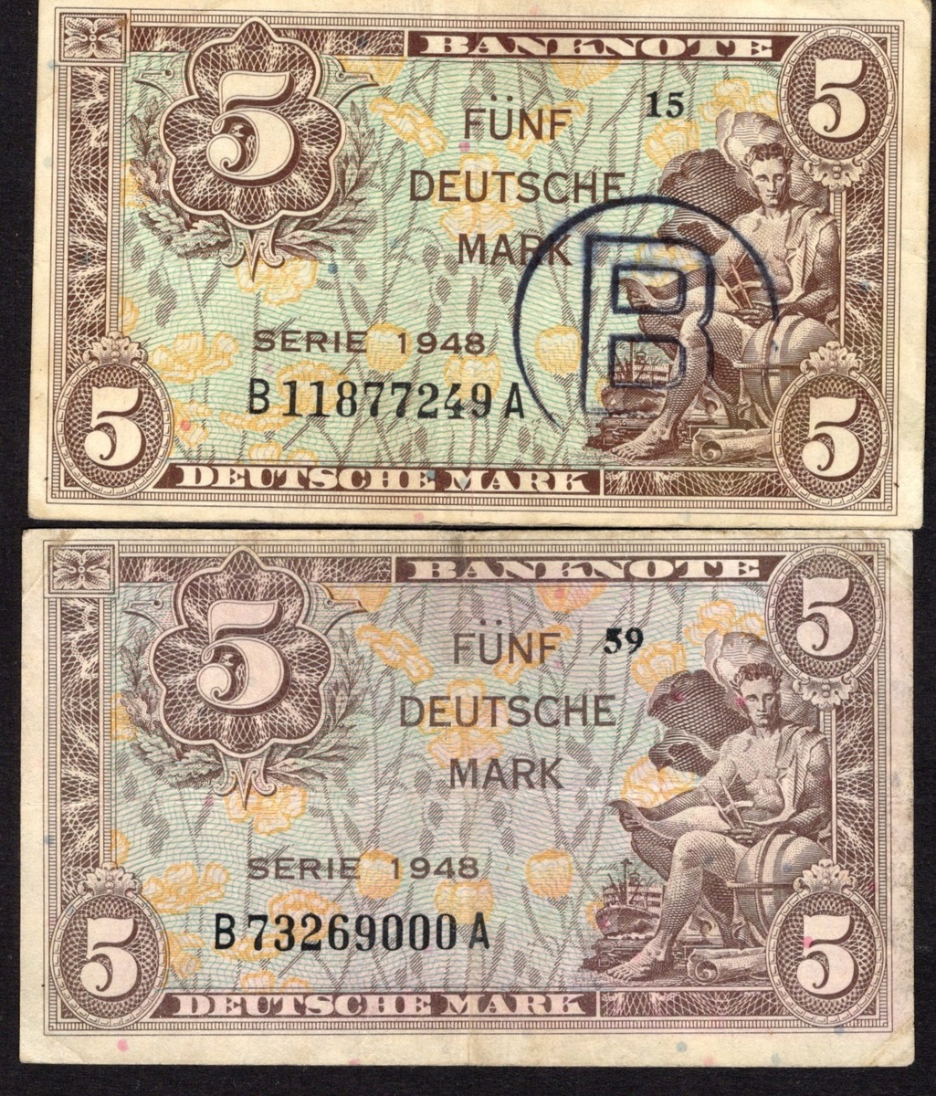 Germany. Allied Occupation, Post WWII. U.S. Army Command. Pair of 5 Deutsche Mark notes. 1948. P-4, 4b. Brown on green and gold. Allegorical man seated at right. The first, soiling back margins, VF; the latter Very Fine. [2]