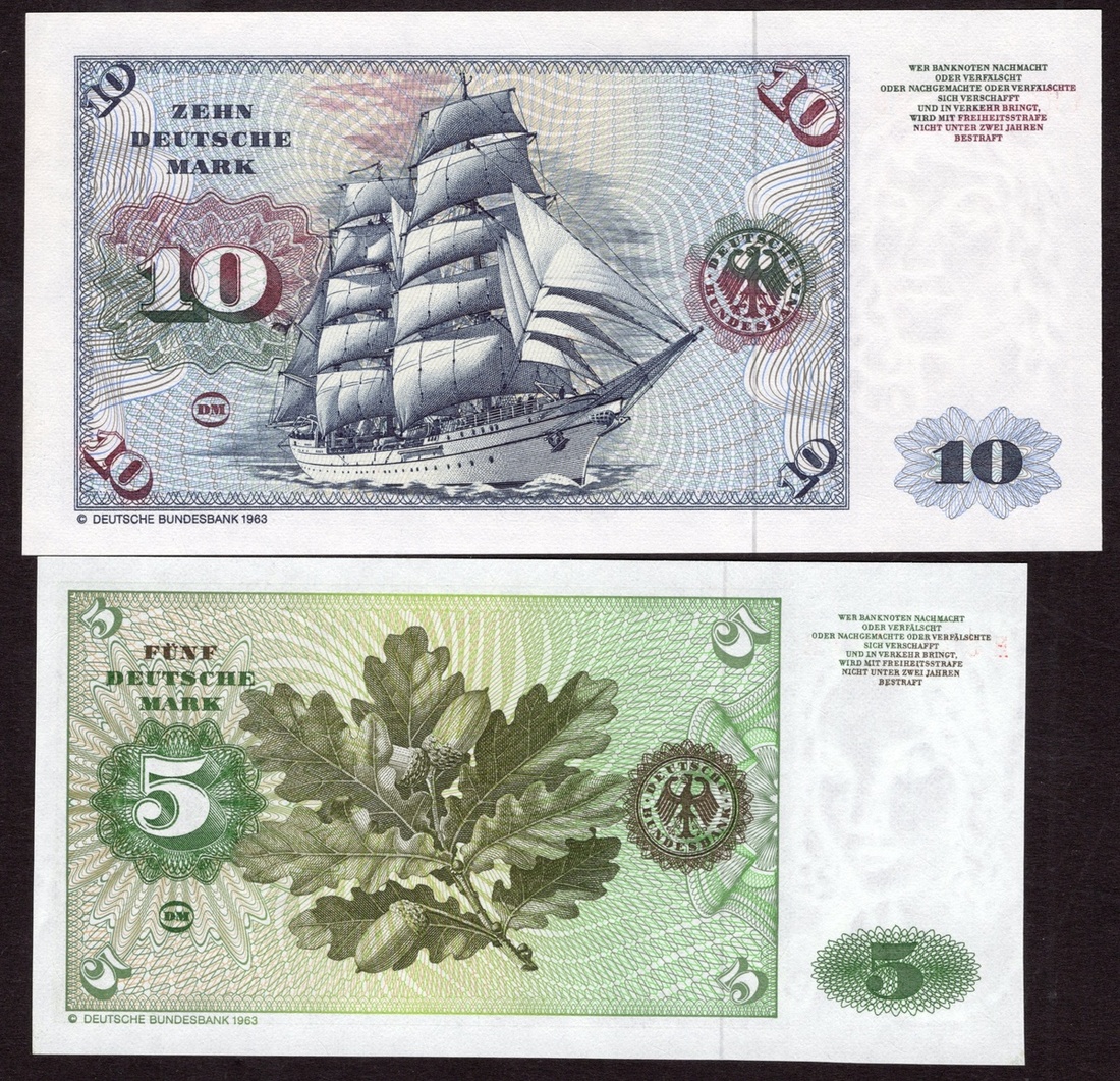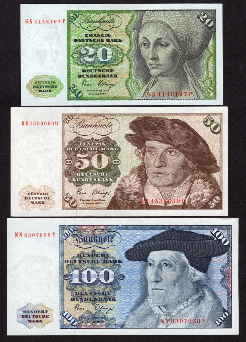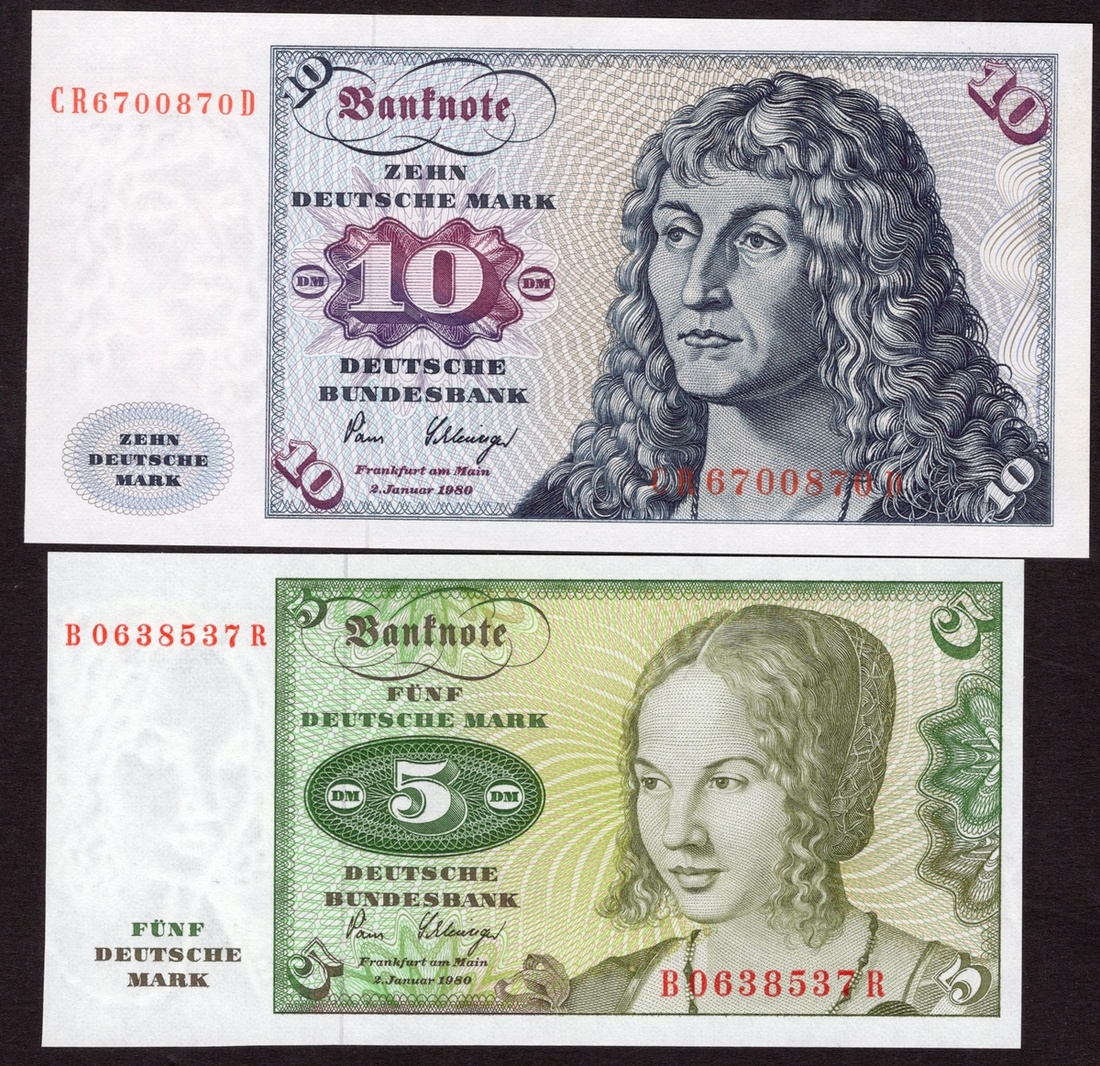 Germany. Bundesrepublik. Deutsche Bundesbank. 5, 10, 20, 50, 100. 1980. P-30b, 31d, 32d, 33d, 34d. Venetian woman, Young man, Elsbeth Tucher by Dürer; Hand Urmiller by Barthel Beham, Master Sebastian Müller by Christoph Amberger. 50 and 100 Crisp EF, others Uncirculated. [5]