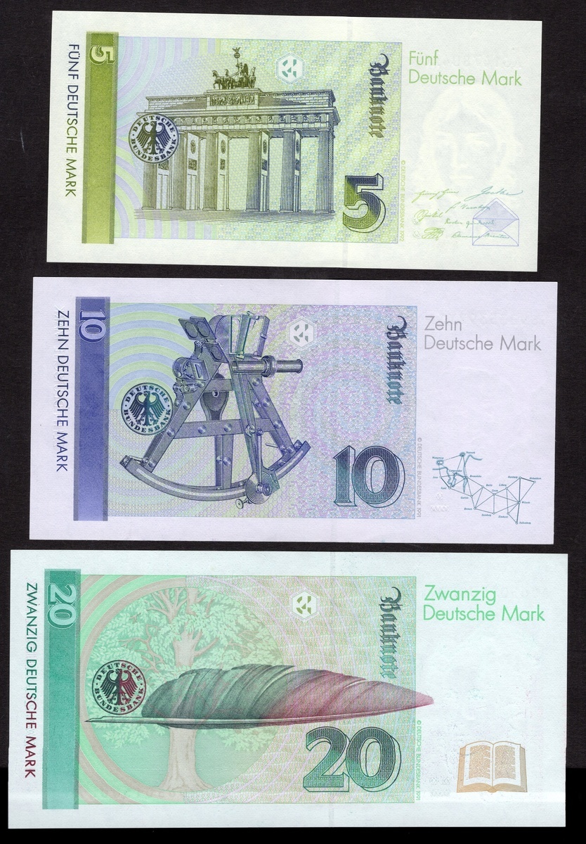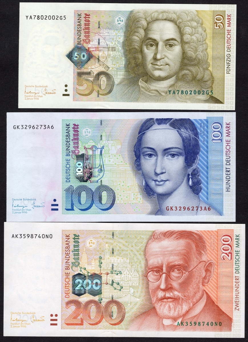 Germany. Bundesrepublik. Deutsche Bundesbank. 5, 10, 20, 50, 100 and 200 Deutsche Mark. 1989-1991 issue. P-37, 38d, 39a, 45, 46, 47. Bettina v. Arnim, Carl Friedrich Gauss, Annette v. Droste-Hülshoff, Balthasar Neuman, Clara Schumann, Paul Ehrlich at right. The 10 DM AU, 50 DM slight teller handling, the 200 DM Crisp EF, the others Uncirculated. [6]